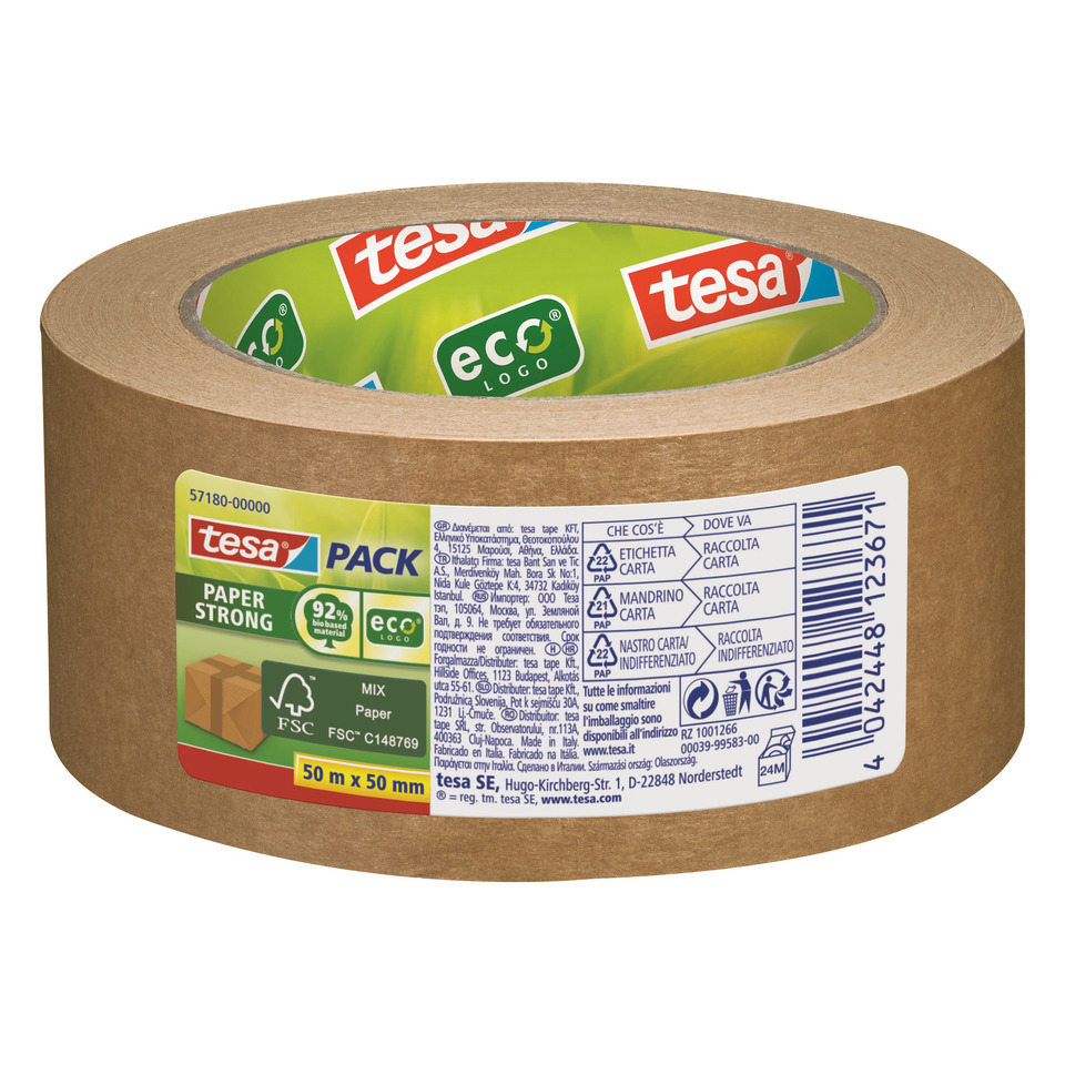 Il nastro da imballo tesa tesapack® Carta ecoLogo® 50 mm x 50 m marrone rappresenta una scelta intelligente per chi cerca un prodotto affidabile, sostenibile e versatile. Offre una combinazione ideale di prestazioni elevate e rispetto per l'ambiente, soddisfacendo le esigenze di imballaggio di privati e aziende.