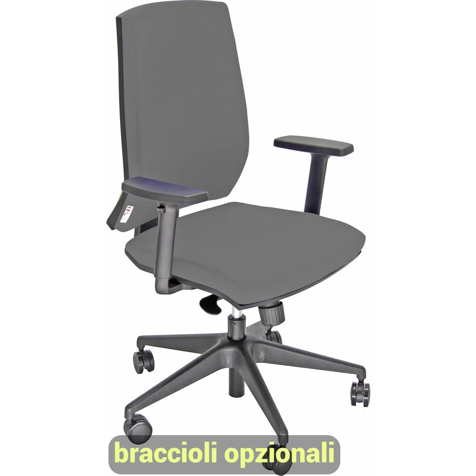 Questa soluzione è progettata pensando al benessere dell'utente durante le lunghe ore di lavoro. La seduta è imbottita con schiuma di alta densità per garantire un supporto ottimale e ridurre la pressione sui punti critici. Lo schienale ergonomico, sagomato per adattarsi alla curva naturale della colonna vertebrale, offre un supporto lombare efficace, prevenendo dolori e affaticamento. Il meccanismo di inclinazione sincronizzato permette di regolare l’inclinazione dello schienale e della seduta in modo coordinato, favorendo una postura corretta e dinamica. L'articolo è dotato di braccioli regolabili in altezza per supportare le braccia e le spalle, riducendo la tensione muscolare. La base a cinque razze in materiale resistente garantisce stabilità e robustezza, mentre le ruote piroettanti permettono di muoversi agevolmente su qualsiasi tipo di pavimento. La funzione di regolazione dell'altezza della seduta, tramite pistone a gas certificato, consente di adattare l'articolo alle proprie esigenze e all'altezza della scrivania. Questa poltrona da ufficio è più di un semplice sedile; è un investimento nel comfort e nella produttività.