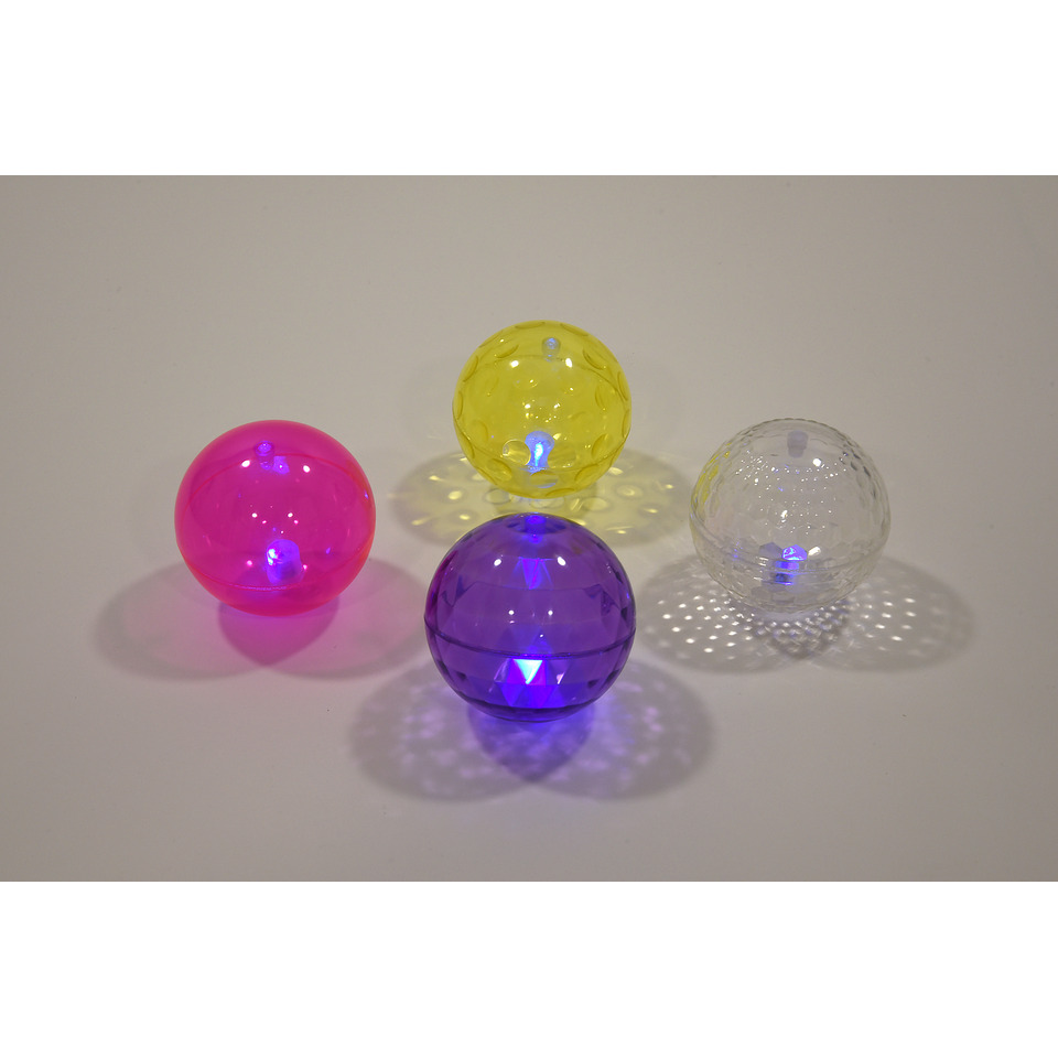 Un set composto da quattro palle in gomma che si illuminano rimbalzando. Quattro colori e superficie a bolle rientranti per stimolare il tatto, facilitando la presa e l'attività di scambio. Diametro 10 cm.