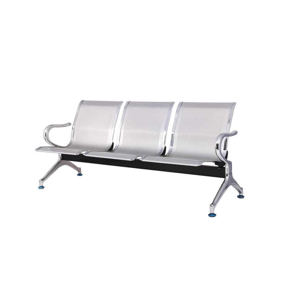Panca in acciaio microforato grigio per sala d'attesa, a 3 posti, con trattamento antiruggine e verniciatura elettrostatica. Profili, gambe e braccioli in acciaio cromato. Spessore lamiera: 1,5 mm. Il tavolino è opzionale e sostituisce una delle sedute. Specifica per ospedali, aeroporti e locali pubblici. Dimensioni: L180 x P68 x H78 cm. Prodotto certificato SGS. Codice produttore: SJ820G-3