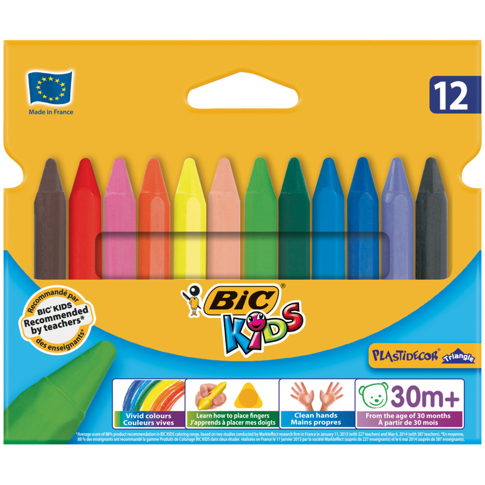 Pastelli a cera BIC Kids Plastidecor® Triangle con con forma maxi triangolare. Il fusto triangolare corto da 9 cm è realizzato appositamente per le manine dei più piccoli. La forma triangolare aiuta i bambini a posizionare correttamente le dita e insegna loro a impugnare la matita. I pastelli Plastidecor sono realizzati in cera di plastica, quindi mani e vestiti rimangono puliti. Ideale per i bambini dai 30 mesi in su. Confezione composta da 12 pezzi in colori assortiti.