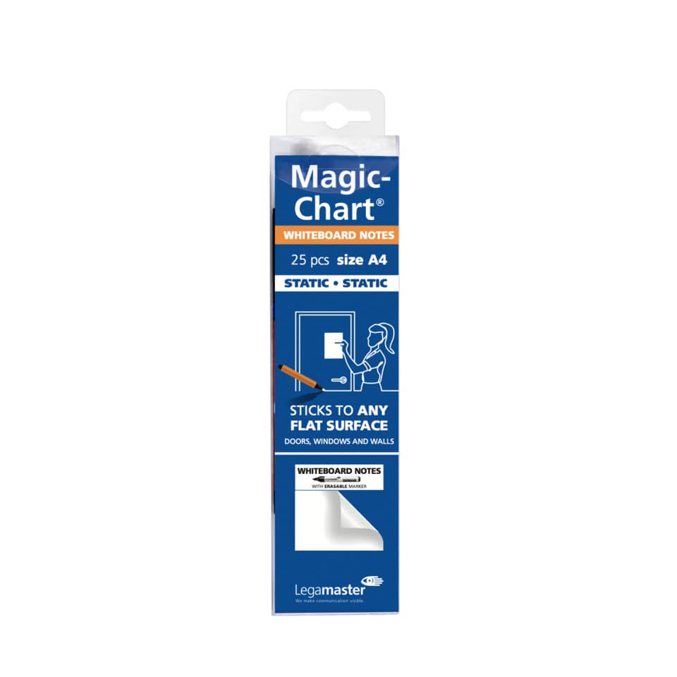 Gli innovativi fogli Legamaster Magic-Chart Whiteboard delle dimensioni di 20x 30 cm si avvalgono dell'elettricità statica per aderire a qualsiasi superficie piatta in modo da creare in un istante una superficie su cui scrivere. La nuova gamma di fogli in polipropilene è perfetta per dare libero sfogo alla creatività e per promuovere la comunicazione interattiva in qualunque ambiente professionale o didattico. Si incollano facilmente e senza problemi senza dover utilizzare la colla e sono adatti per l'uso con i marcatori permanenti. Perfetti per essere utilizzati al posto delle lavagne bianche, vengono forniti in un rotolo formato A4 da 25 fogli.