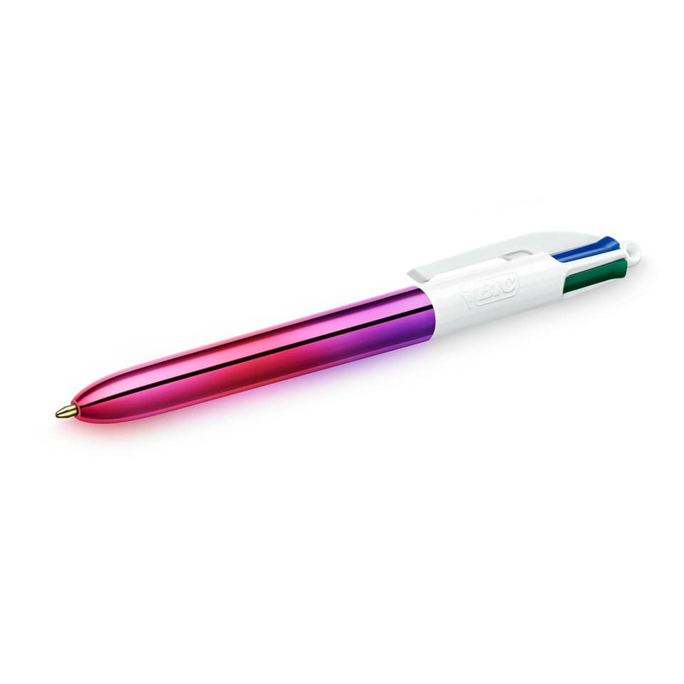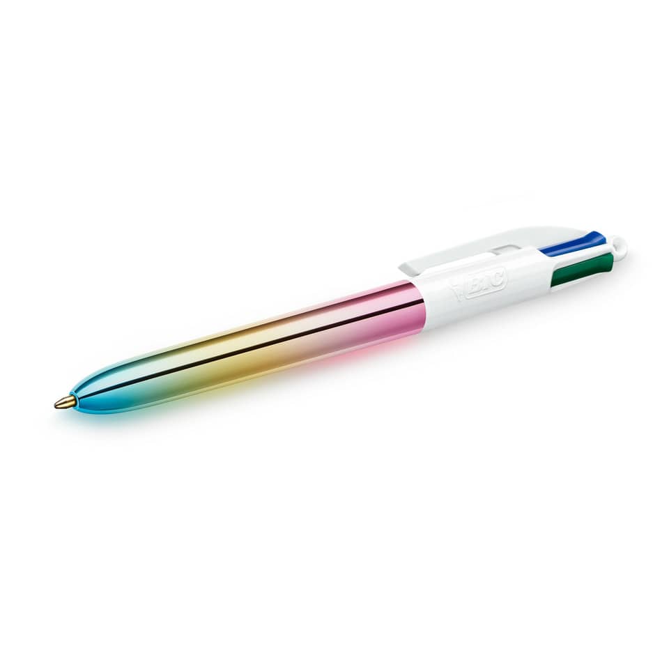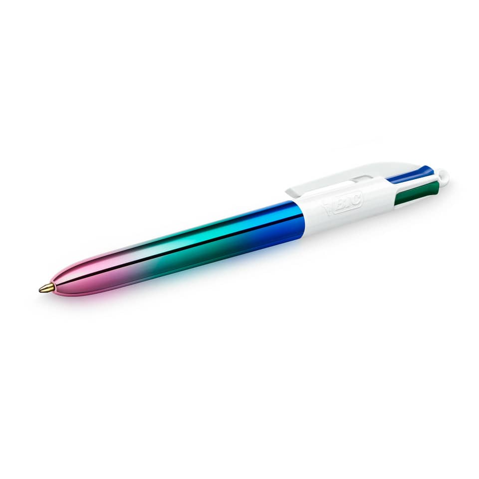 L'iconica penna a scatto dai 4 colori classici (nero, blu, rosso, verde) in una particolare versione dal fusto metallizzato con molteplici tonalità di colore nella stessa penna. Le 12 penne nella confezione hanno 3 diversi motivi con luminose sfumature tricolori sui fusti. Punta: 1 mm. Larghezza del tratto: 0.32 mm. Ogni penna può scrivere in media 8 km.
