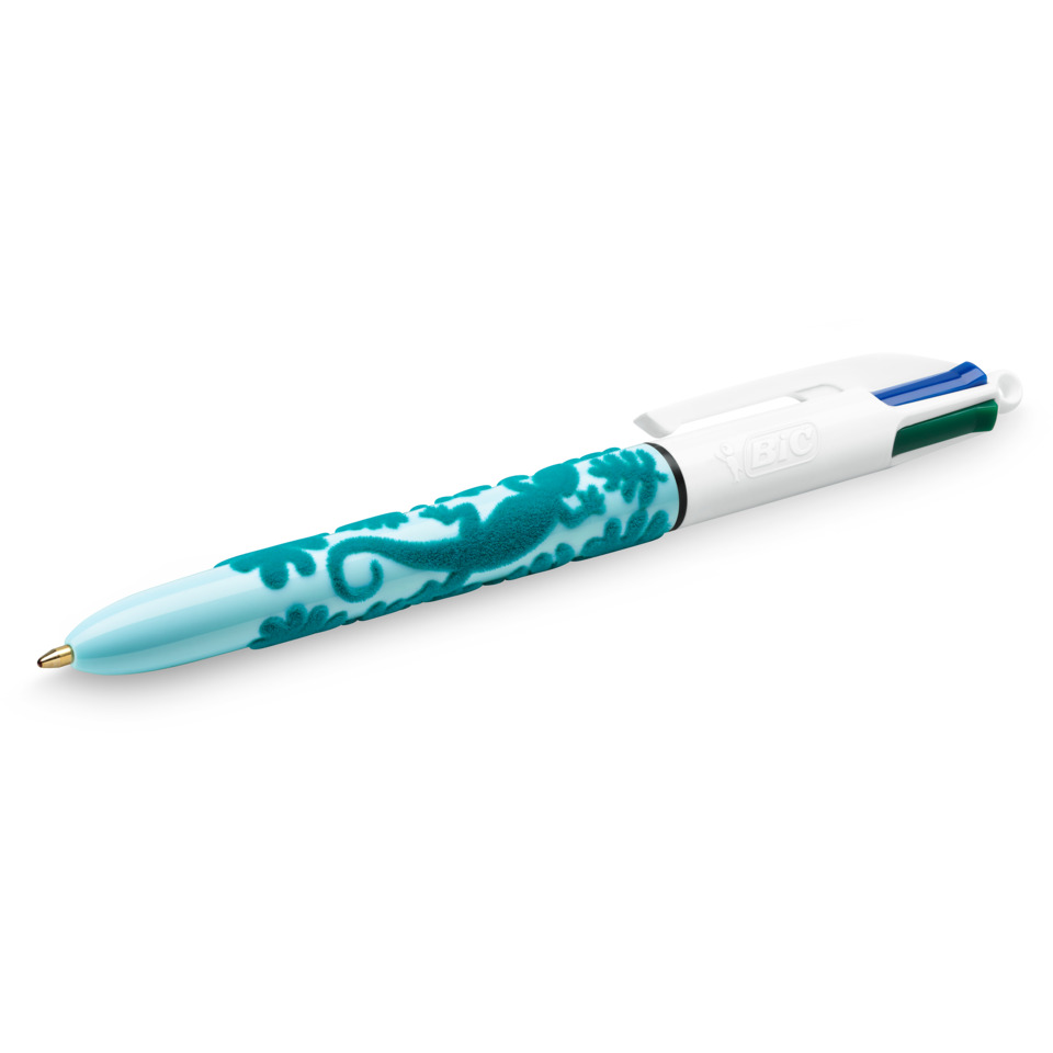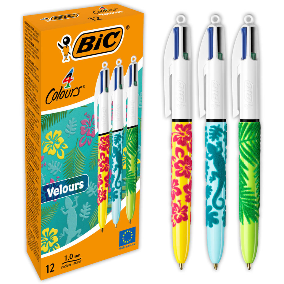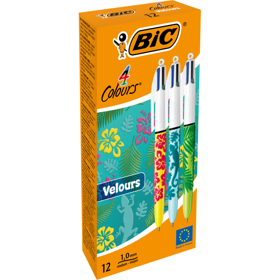 Scrivere con stile con la penna BIC 4 Colours Velours! Questa penna a sfera multifunzione offre 4 colori classici (rosso, verde, blu, nero) e una punta media da 1 mm per una scrittura pulita e precisa. Il fusto, con una morbida decorazione in velluto, è disponibile in 3 diverse fantasie: foglie, fiori o geko. In confezione da 12 fantasie assortite.