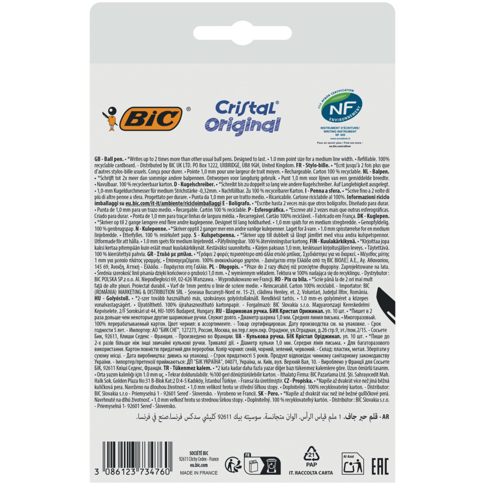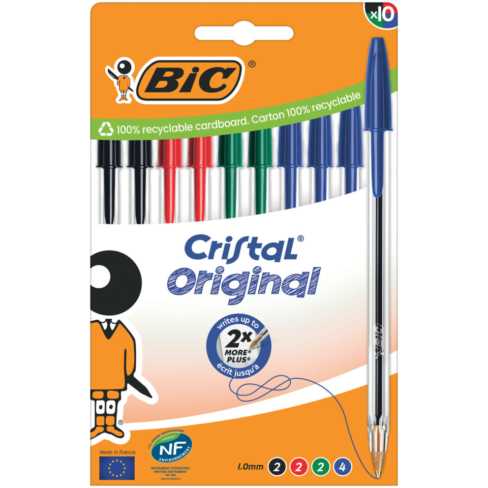 BIC® Cristal Original è la penna iconica adatta per la scrittura a casa, scuola ed in ufficio. Dotata di sfera in carburo di tungsteno, la punta media da 1 mm e il fusto esagonale offrono un'esperienza di scrittura scorrevole e confortevole, mentre il fusto trasparente consente di controllare il livello dell'inchiostro. Il cappuccio e il tappino hanno lo stesso colore dell'inchiostro della penna. L'inchiostro di alta qualità si asciuga rapidamente e dura a lungo. È un prodotto sostenibile, certificato NF Environment, in quanto con il minimo utilizzo di materie prime, scrive in media 3 km. La confezione è in cartoncino riciclabile al 100%. Confezione composta da 10 penne (4 blu, 2 nero, 2 rosso, 2 verde).