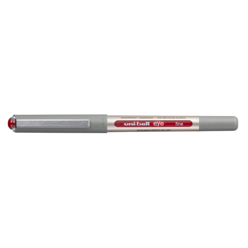 Penna roller a inchiostro liquido pigmentato a base d'acqua, resistente all'acqua e alla luce. Dotato di sistema di inchiostrazione ''Uni-Flow System'', che garantisce un flusso uniforme e costante dell'inchiostro e una scrittura scorrevole e precisa. Asciugatura rapida. Fusto caratterizzato da una finestra per il controllo del consumo dell'inchiostro. Cappuccio anti-soffocamento, clip in metallo. Punta in acciaio inossidabile e sfera in carburo di tungsteno 0,7 mm. Plastica riciclata al 70%. Colore inchiostro: rosso.