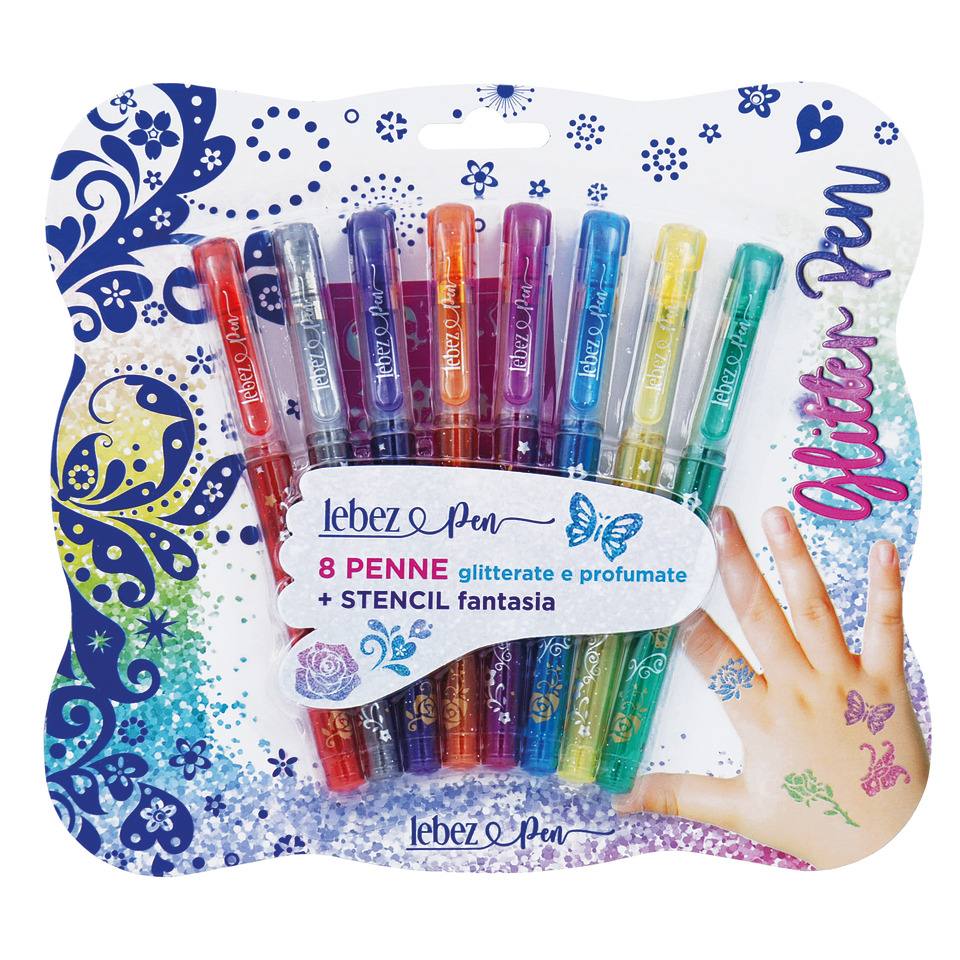 Penne gel glitter con cappuccio e inchiostro profumato + stencil Lebez – colori assortiti – 5340 (conf.6)