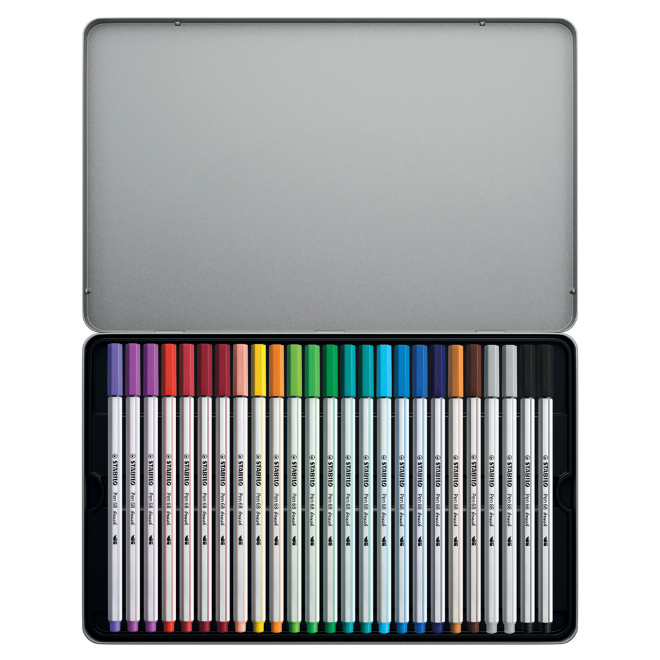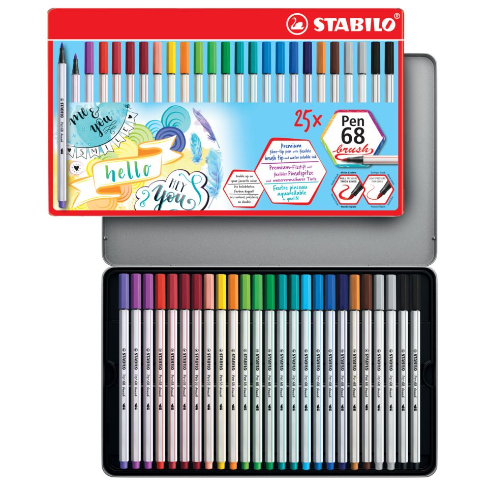 Con il pennarello Stabilo Pen 68 brush puoi controllare perfettamente i tuoi tratti, creando bellissime lettere in vero stile hand lettering. Potrai realizzare bellissime opere in modo semplice e veloce. Con la sua punta flessibile, questo pennarello si aggiunge alla famiglia Pen 68 ed è adatto sia ai principianti che agli artisti esperti. Variando la pressione sulla punta puoi usare il ''pennello'' per creare linee spesse o sottili sulla carta. Puoi creare altri effetti speciali con l'inchiostro a base d'acqua: bellissime sfumature di colore o fantastici acquarelli. Strumento ideale per decorazioni e lavori fai da te. Risultati garantiti e garanzia tedesca. Ideale per chi è alle prime armi con il brush lettering: grazie alla sua punta a pennello molto flessibile, hai subito la percezione della pressione che stai facendo. Usa la giusta pressione per disegnare line più spesse o più sottili – la punta è stata sviluppata proprio per i principianti! Per artisti più esperti, Pen 68 brush copre un ampio spettro creativo: dalle applicazioni artistiche all'ombreggiatura e all'acquarello. Combina le tue sfumature preferite e i risultati saranno unici. L'inchiostro a base d'acqua fornisce un ulteriore tocco creativo: usalo per creare fantastici effetti speciali come la fusione dei colori o gli effetti dell'acquerello Pen 68 brush dura 24 ore senza cappuccio e la punta non secca! Sviluppato da e insieme ai nostri fan - realizzato per soddisfare tutte le esigenze creative. Realizzato in Germania. Prodotto in conformità con il regolamento REACH (CE) n. 1907/2006. Prodotto in conformità con la direttiva sulla sicurezza dei giocattoli 2009/48/EC. Prodotto in conformità con la norma europea EN71 – 1, 2, 3 e 9. Marchio CE. Prodotto in conformità con la direttiva 94/62/EC sugli imballaggi e i rifiuti di imballaggio. Età consigliata: 8 anni in su. Confezione in metallo composta da 25 pezzi, colori assortiti.