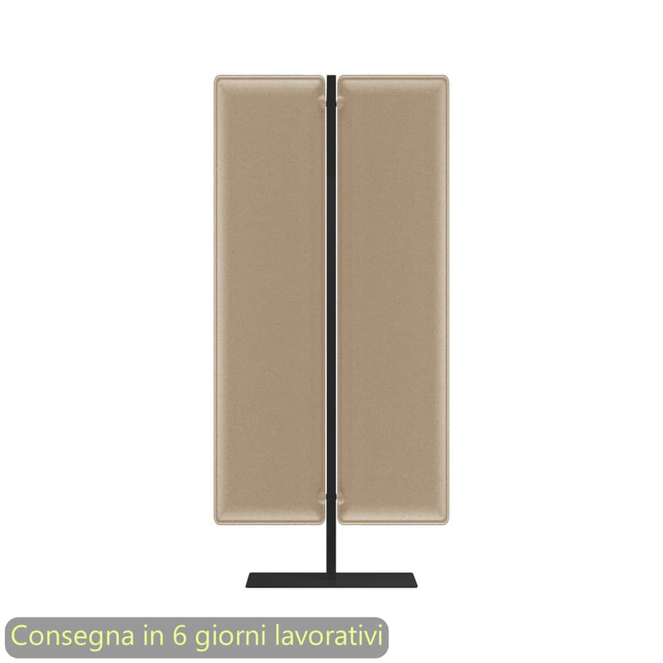 Questa piantana mobile si distingue per la sua versatilità e funzionalità. La struttura in metallo nero offre stabilità e un aspetto moderno, integrandosi facilmente in diversi stili di arredamento, da quelli minimalisti a quelli industriali. I due pannelli fonoassorbenti avorio riducono significativamente la riverberazione e l'eco, migliorando la chiarezza del suono e creando un ambiente più confortevole. La dimensione di 83,8xH.160 cm la rende ideale per uffici open space, sale riunioni, ma anche per ambienti domestici come soggiorni o sale studio. La mobilità di questo prodotto è un vantaggio significativo, permettendo di spostarlo facilmente a seconda delle esigenze e di adattarlo a diverse configurazioni spaziali. Il rivestimento dei pannelli in tessuto avorio non solo contribuisce all'efficacia fonoassorbente, ma aggiunge anche un tocco di eleganza e calore visivo. Questa soluzione è particolarmente indicata per chi necessita di un controllo acustico flessibile e adattabile, senza rinunciare al design e all'estetica.