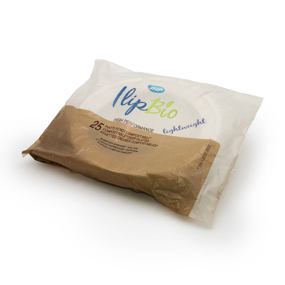 Piatti fondi in materiale MATER-BI BIO / Compostabile. Per cibi caldi/freddi. Temperatura MAX 70° per 2 ore. Smaltimento: Organico(secondo comune di appartenenza). Peso: 14 gr. Dimensioni: Ø 210 mm.