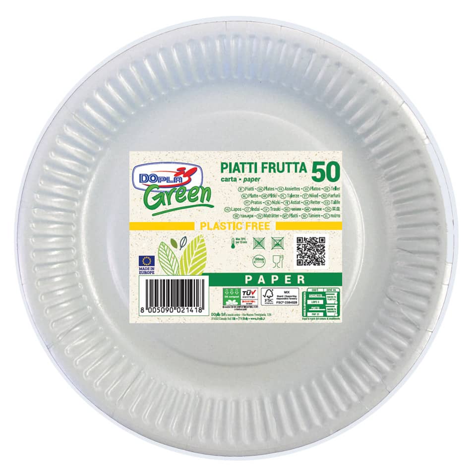 I Piatti frutta carta fibra vergine Dopla Green sono realizzati in fibra di carta vergine di alta qualità, una risorsa rinnovabile e biodegradabile. Questa caratteristica li rende un'opzione eccellente per chi è attento alla sostenibilità. La fibra vergine assicura inoltre una maggiore resistenza e rigidità rispetto ai piatti in carta riciclata, garantendo che l'articolo possa sostenere il peso della frutta o dei dolci senza deformarsi. Il diametro di 180 mm è perfetto per porzioni individuali di frutta fresca, insalate di frutta, coppe gelato o pasticcini. La confezione include 50 piatti, offrendo una quantità adeguata per ospitare un piccolo gruppo di persone o per un utilizzo prolungato nel tempo. Il colore bianco conferisce un aspetto pulito e versatile, adattabile a qualsiasi tipo di tavola o evento. Questa soluzione è progettata per essere compostabile, contribuendo a ridurre la quantità di rifiuti destinati alle discariche. La superficie liscia e igienica è ideale per il contatto con gli alimenti, garantendo un'esperienza di consumo sicura e piacevole. Si tratta di un prodotto monouso, che semplifica le operazioni di pulizia e riduce il rischio di contaminazione crociata.