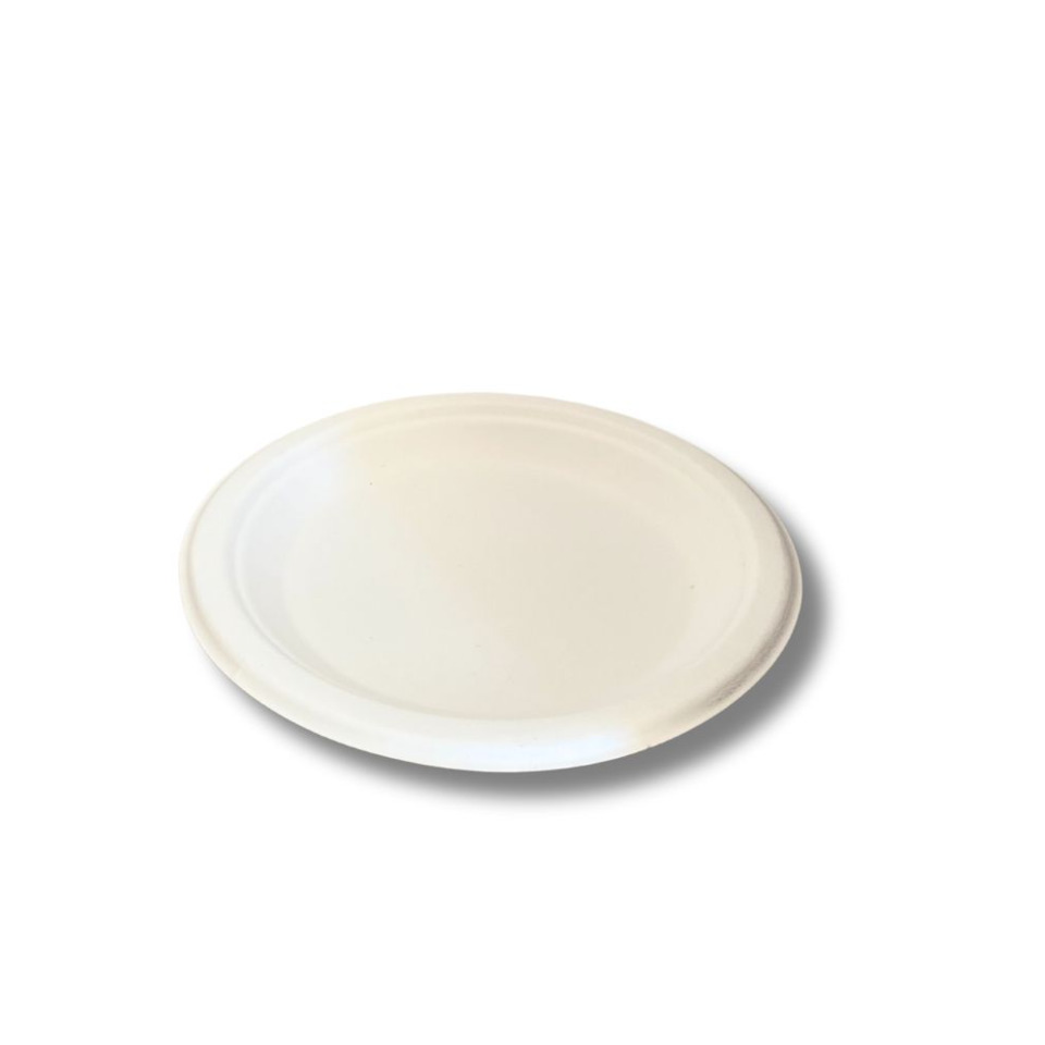 Piatti dessert in bagassa in busta biodegradabile e compostabile in PLA. Diametro: 175 mm. Altezza: 15,8 mm. Peso: 8,0 grammi. Contenuto per confezione: 100 pezzi. Temperatura di esercizio: da -18 °C a +100 °C (per liquidi); +45°C (per oli). Utilizzabile in microonde ad alte temperature e freezer a basse temperature. Certificazioni: TUV HOME - TUV INDUSTRIAL. Materiale: bagassa sbiancata. Prodotto PFAS free.