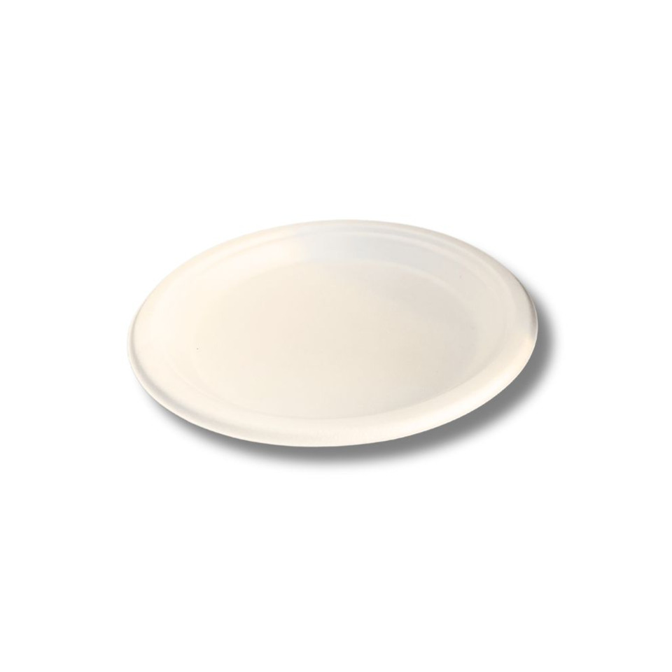 Piatti piani in bagassa confezionati in busta biodegradabile e compostabile realizzata in PLA. Diametro: 225 mm. Altezza: 19,6 mm. Peso: 15 grammi. Dimensioni: 225 x 19,6 mm. Temperatura di esercizio: da -18 °C a +100 °C (per liquidi); +45 °C (per oli). Utilizzabile in microonde ad alte temperature e in freezer a basse temperature. Certificazioni: TUV HOME - TUV INDUSTRIAL. Materiale: bagassa sbiancata. Prodotto PFAS free. Contenuto per confezione: 100 pezzi.