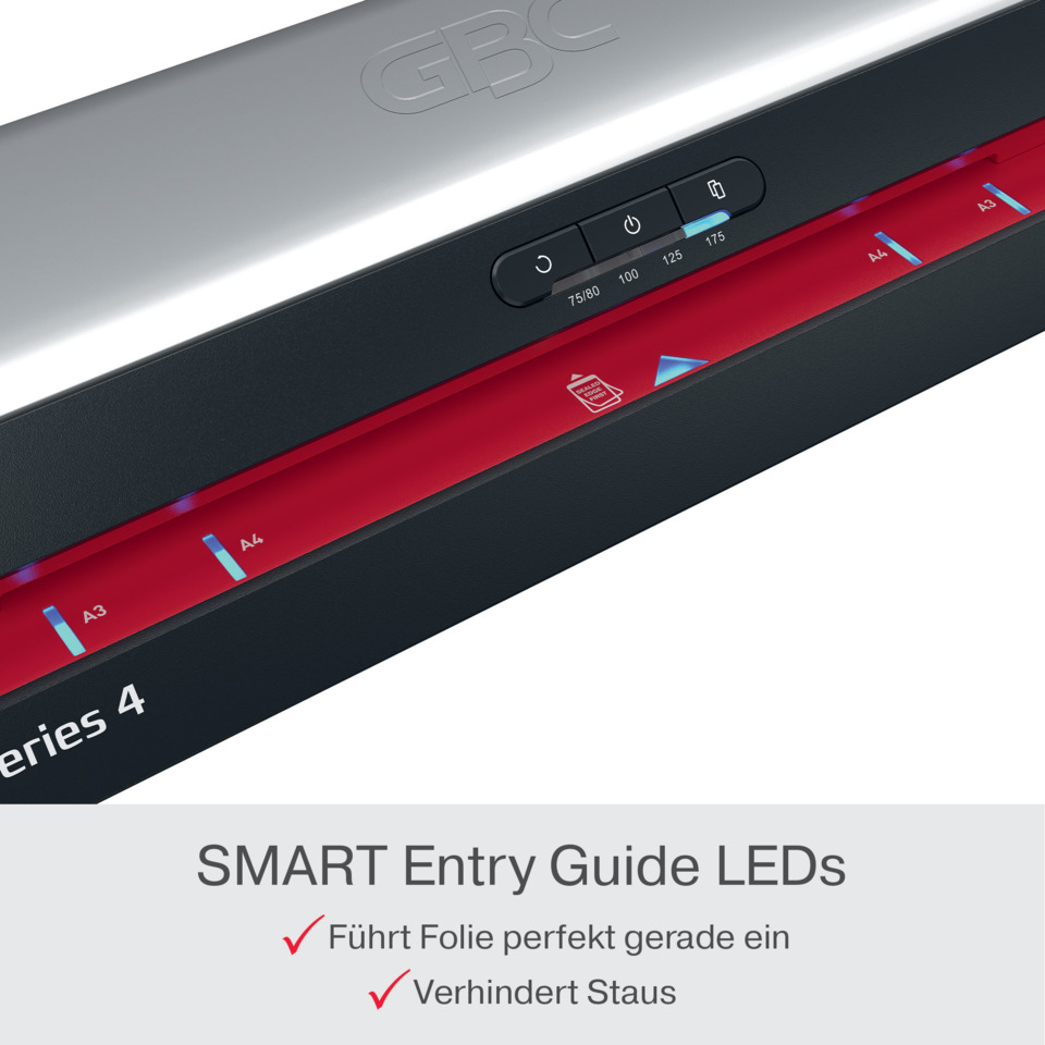 la plastificatrice GBC 480HS A3 rappresenta una soluzione affidabile ed efficiente per le esigenze di plastificazione di grandi volumi. Progettata per ambienti professionali, questa plastificatrice ad alta velocità combina prestazioni e facilità d'uso. Aumenta la produttività e riduci i tempi di plastificazione del 33% utilizzando le pouch ad alta velocità GBC. Con un rapido tempo di riscaldamento di 1 minuto, plastifica un foglio A4 da 75 micron in soli 23 secondi, rendendolo ideale per le attività d'ufficio a ritmo sostenuto. Il pannello di controllo intuitivo offre quattro impostazioni di spessore della pouch da 75 a 175 micron, garantendo flessibilità per vari tipi di documenti. Il pannello è inoltre dotato di un pulsante di inversione manuale e di una funzione di inversione automatica con rilevamento attivo dell'inceppamento per una rimozione perfetta della pouch. Inoltre, il sistema di LED di stato SMART fornisce chiari segnali visivi e acustici: rosso durante il riscaldamento, blu con un suono quando è pronto e uno spegnimento automatico dopo 15 minuti di inattività per risparmiare energia. I LED della guida d'ingresso SMART assicurano l'allineamento della pouch per evitare inceppamenti, rendendo perfetta ogni plastificazione. Proteggi e conserva i tuoi documenti importanti con velocità e con una finitura liscia e professionale ogni volta. Colore nero e rosso.