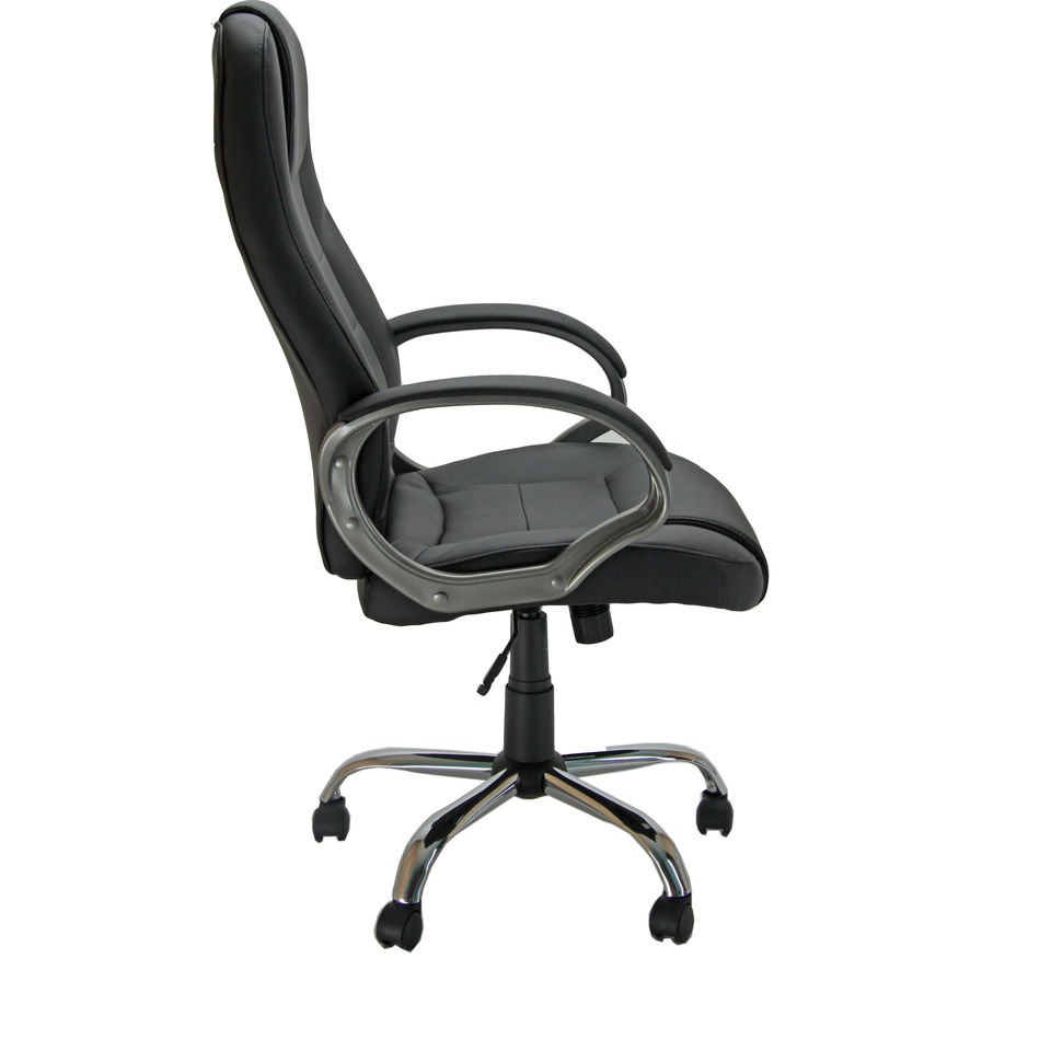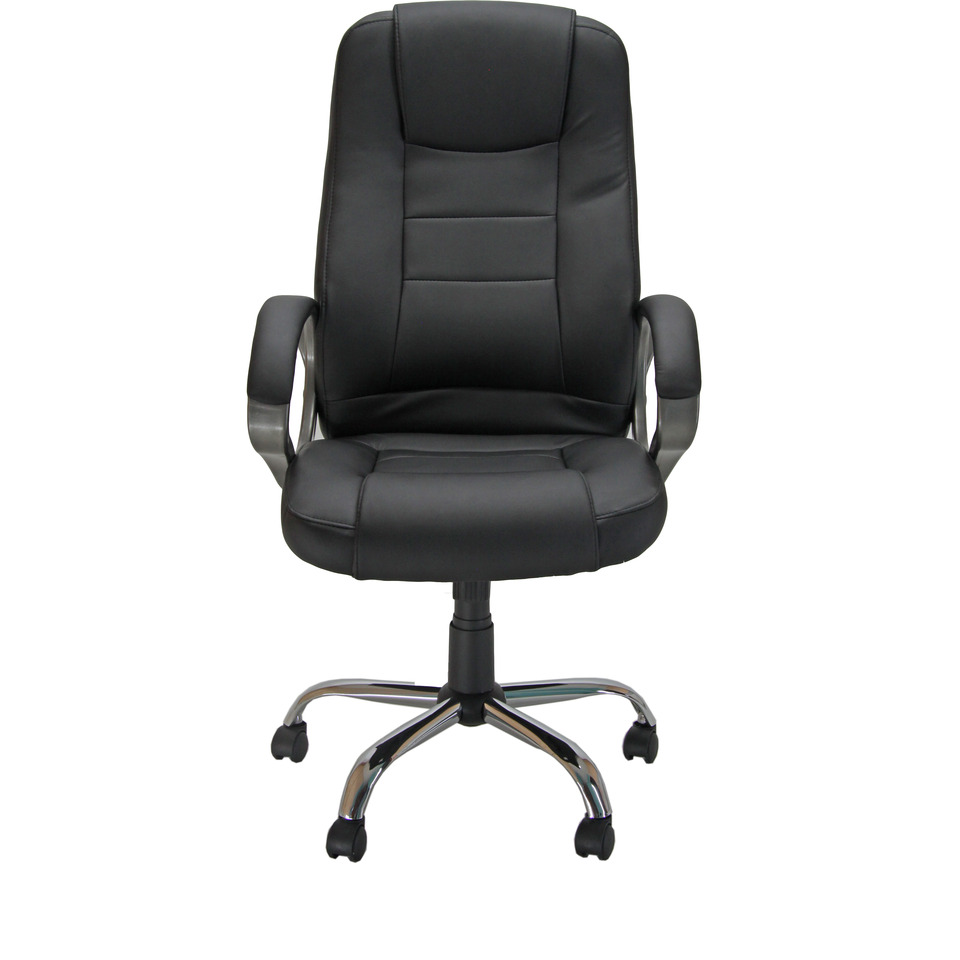 Poltrona direzionale girevole in PU nero. Base cromata e compresa di braccioli. Taglia L. Utilizzo consigliato moderato: 6h. Portata massima 100 Kg. Struttura faggio multistrato. Base in acciaio. Ruote Ø 50 mm nylon. Sedile - materiale esterno: rivestita; materiale interno: faggio multistrato; spugna: spugna T 21 h 6,5 cm. Schienale - materiale esterno: rivestita; materiale interno: faggio multistrato; spugna: spugna T 18 h 6 cm. Meccanismi: elevazione a gas - schienale regolabile in altezza - meccanismo oscillante con blocchi dotato di variatore di spinta. Certificazioni: Gas certificato TUV. Altezza totale: 110-120 cm. Profondità totale: 65 cm. Sedile Altezza sedile (seduta da terra): 43-53 cm. Larghezza sedile: 53 cm. Larghezza del sedile con i braccioli: 65 cm. Profondità sedile: 52 cm. Altezza schienale: 72 cm. Larghezza schienale: 52 cm. Base: Ø 62 cm.