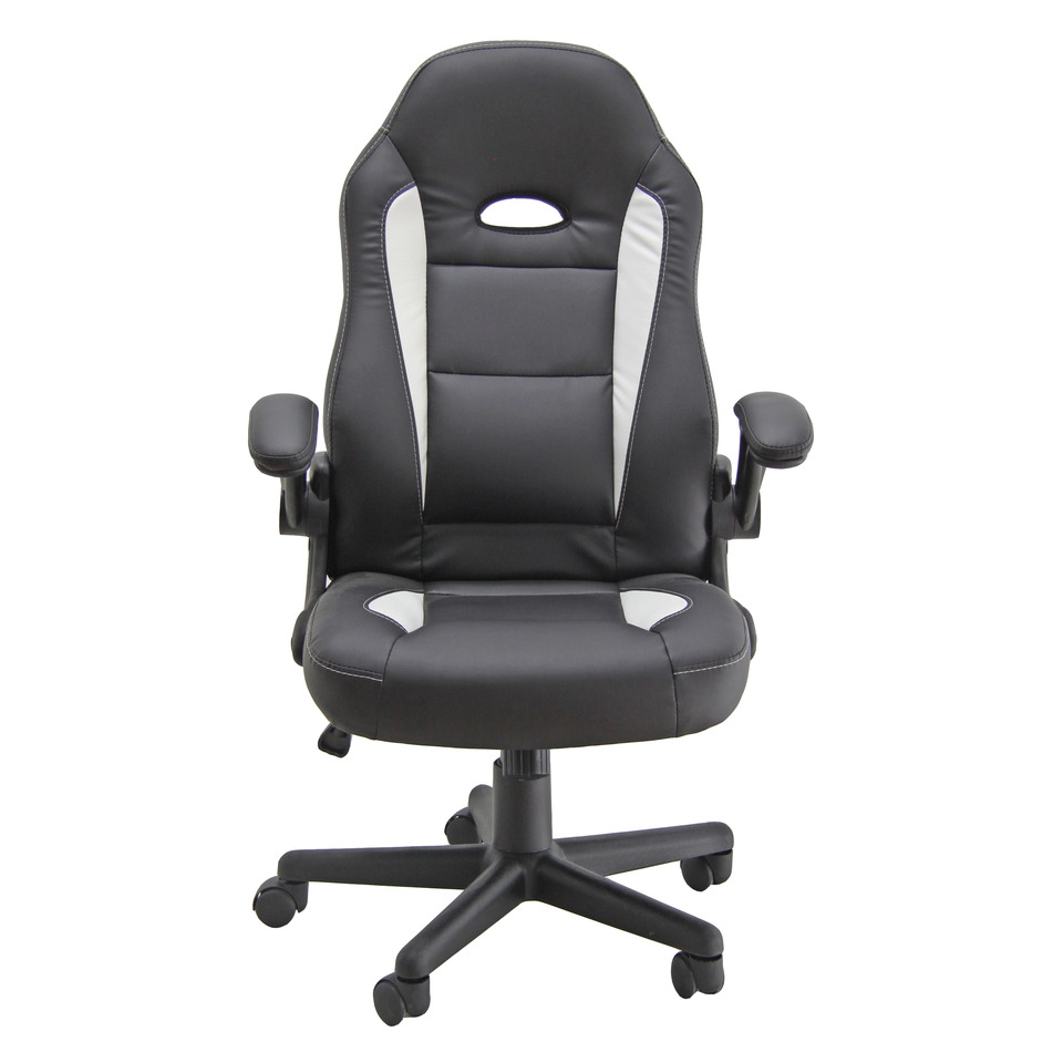Poltrona direzionale girevole in PU, colore nero e bianco. Base verniciata. Fornita con braccioli neri. Taglia M. Utilizzo consigliato moderato: 6h. Portata massima 100 Kg. Struttura faggio multistrato. Base nylon. Ruote Ø 50 mm nylon. Sedile: materiale esterno: rivestita; materiale interno: faggio multistrato; spugna: spugna T 21 h 6,5 cm. Schienale: materiale esterno: rivestita; materiale interno: faggio multistrato; spugna: spugna T 18 h 6 cm. Meccanismi: elevazione a gas - schienale regolabile in altezza - meccanismo oscillante con blocchi dotato di variatore di spinta. Altezza totale: 104-110 cm. Profondità totale: 65 cm. Altezza sedile (seduta da terra): 41-50 cm. Larghezza sedile: 48 cm. Laghezza del sedile con i braccioli: 64 cm. Profondità sedile: 44 cm. Altezza schienale: 68 cm. Larghezza schienale: 48 cm. Base: Ø 60 cm.