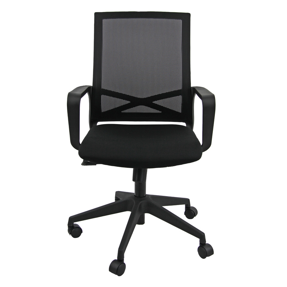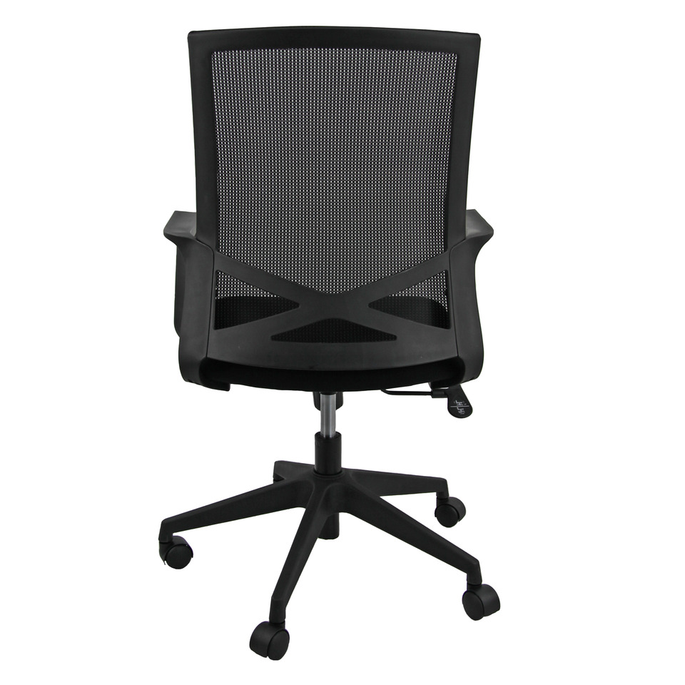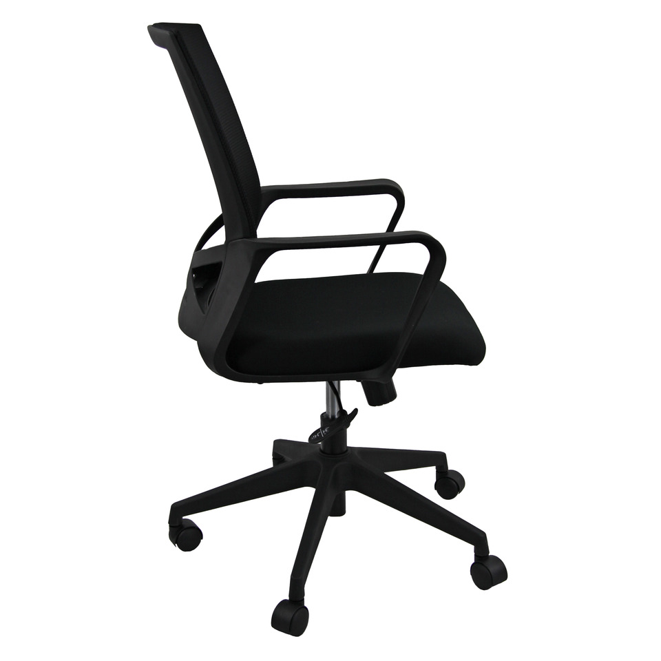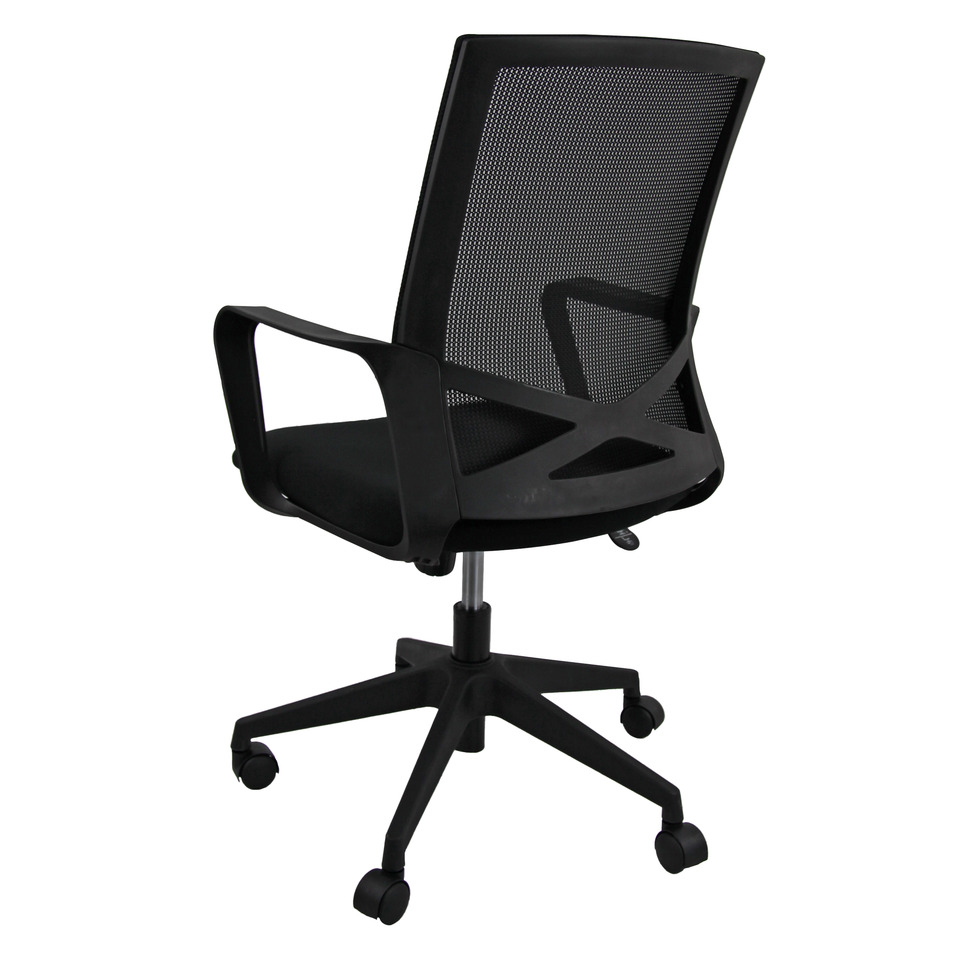 Poltrona direzionalre girevole con schienale in vetroresina colore nera e rete nera. Sedile in tessuto Eco colore nero. Base nylon nera. Comprensiva di braccioli in vetroresina nera. Taglia L. Utilizzo consigliato moderato: 6h. Portata massima 100 Kg. Struttura poliamide. Base NYLON. Ruote Ø 50 mm nylon. Sedile: materiale esterno: rivestita; materiale interno: faggio multistrato; spugna: Spugna T 18 h 6 cm. Schienale: materiale esterno: rete; materiale interno: spugna. Meccanismi: elevazione a gas - meccanismo oscillante con blocco. Altezza totale: 90 - 101 cm. Profondità totale: 64 cm. Altezza sedile (seduta da terra): 40 - 51 cm. Larghezza sedile: 47 cm. Larghezza del sedile con i braccioli: 62 cm. Profondità sedile: 48 cm. Altezza schienale: 53 cm. Laghezza schienale: 44 cm. Altezza braccioli da terra: 59 - 70 cm. Base: Ø 64 cm.