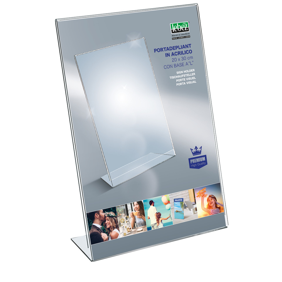 Portadepliant in acrilico con base a L Lebez formato 20×30 cm – verticale – Trasparente – 7057
