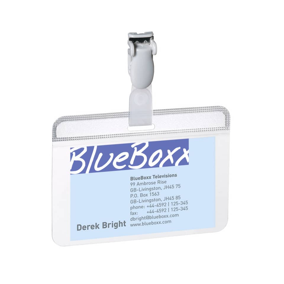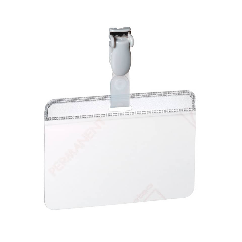 Portanome autolaminante con clip in plastica trasparente. Formato orizzontale 54x90mm(HxL). Cartoncino inserto incluso nella confezione da 25 pezzi.