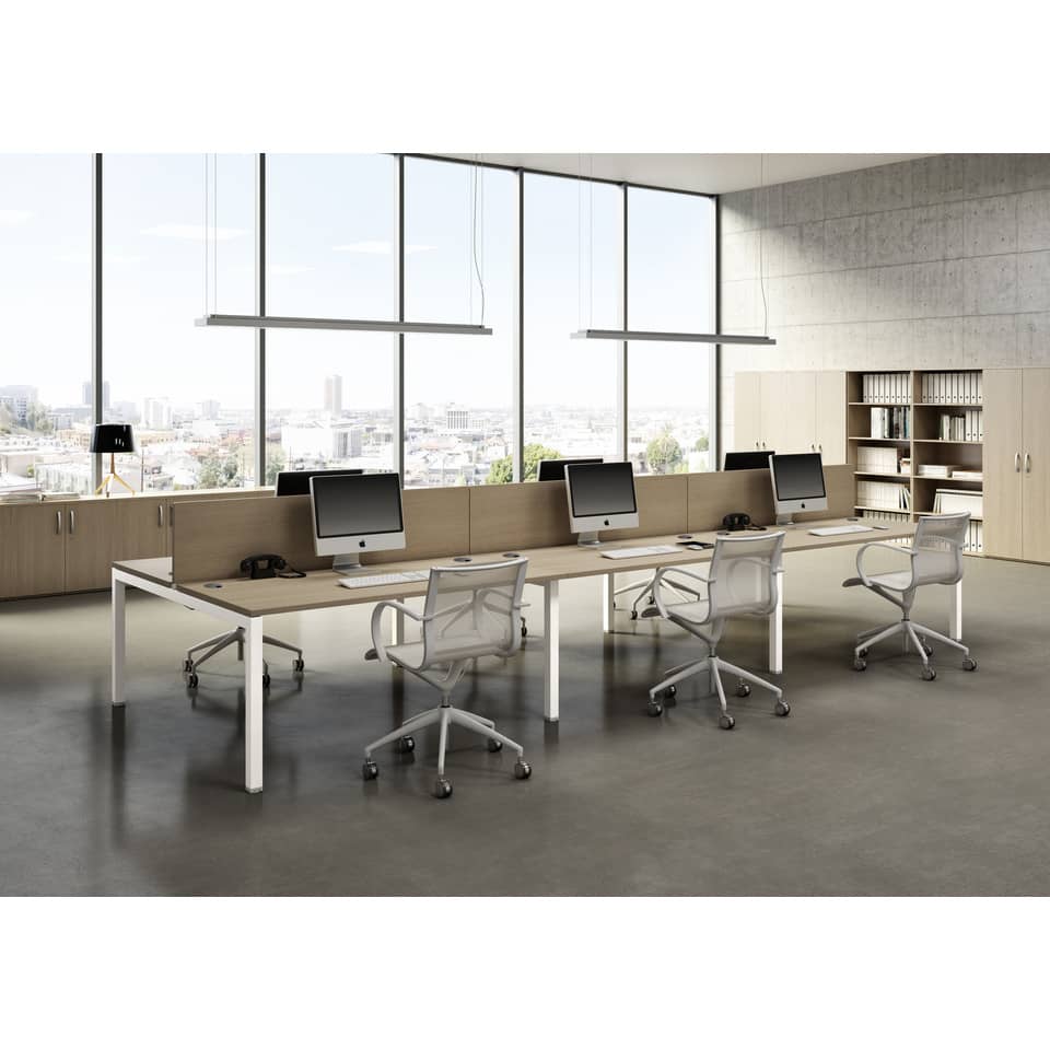 Bench / 2 postazioni cm 140 x 168 x 72,5 h, rovere.Bridge, linea che rappresenta la soluzione ideale per allestire ambienti di lavoro open-space con postazioni di lavoro multiple. Robuste gambe a ponte in metallo a sezione quadrata (50 x 50 mm) verniciate a polveri epossidiche complete di piedini regolabili in altezza. Piani disponibili nei colori bianco o rovere, in bilaminato nobilitato melaminico conforme alle norme UNI e EN classe E1, antigraffio ed antiriflesso sp. 25 mm con bordo sp. 2 mm in ABS resistente agli urti. Tutti i piani di lavoro sono completi di serie di due pratici e funzionali anelli passacavi. Disponibili postazioni di lavoro doppie allestibili con o senza pannello divisorio opzionale. Lo spazio fra i due piani di lavoro contrapposti è di 8 cm. L’esclusivo sistema di assemblaggio permette di allestire postazioni multiple affiancate le une alle altre utilizzando una sola gamba intermedia a profondità ridotta in corrispondenza del punto di giunzione fra i bench. Questa soluzione tecnica, oltre a consentire un risparmio economico, offre la possibilità di ridurre gli ingombri. Pannelli divisorio in melaminico per scrivanie singole e bench da agganciare al desktop.