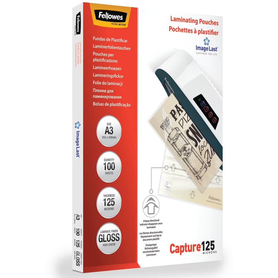 Pouches A3 per plastificatrici Fellowes – 125µm per lato – lucida (conf.100)
