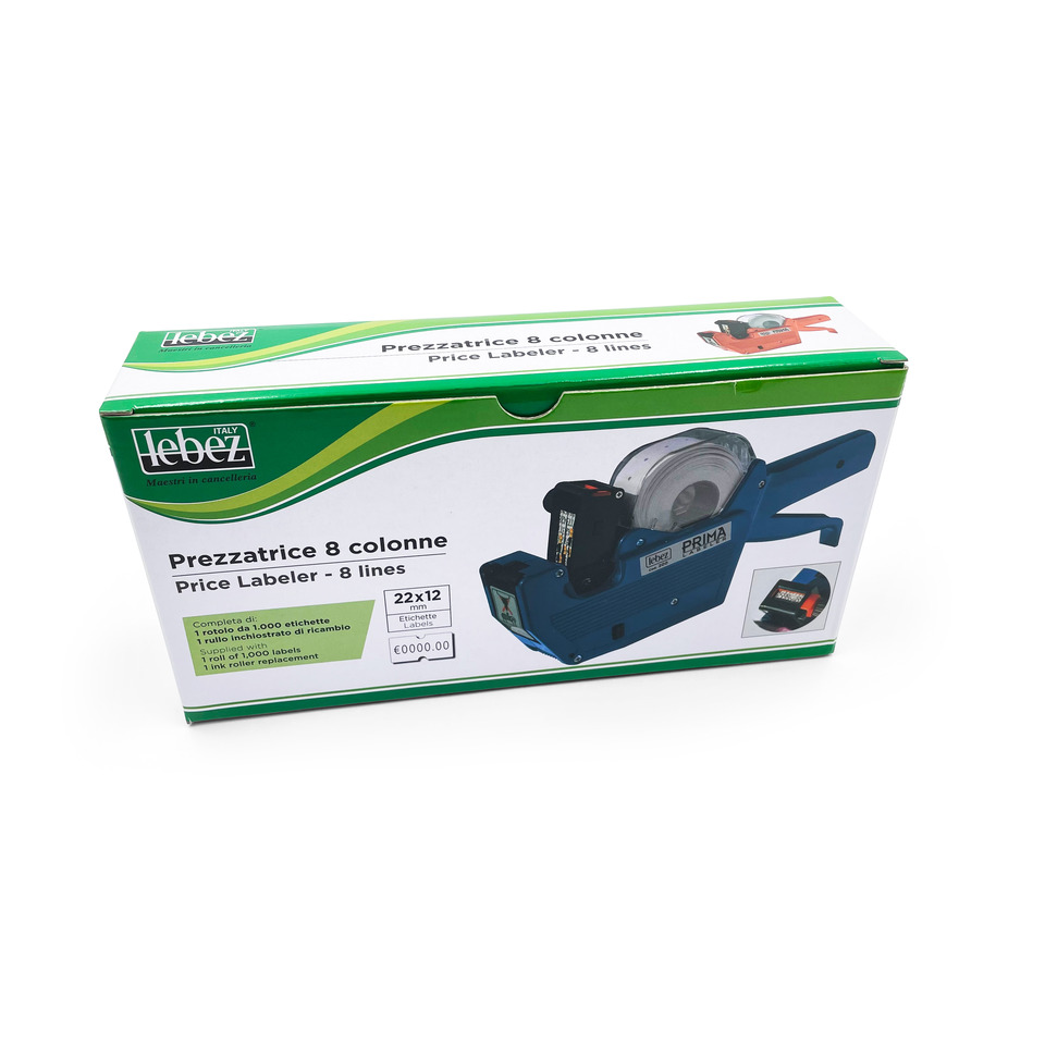 Prezzatrice realizzata in ABS a 8 colonne a pista singola. Completa di 1 rotolino di etichette 21x12 mm e 1 rullo inchiostrato. Colore rosso.