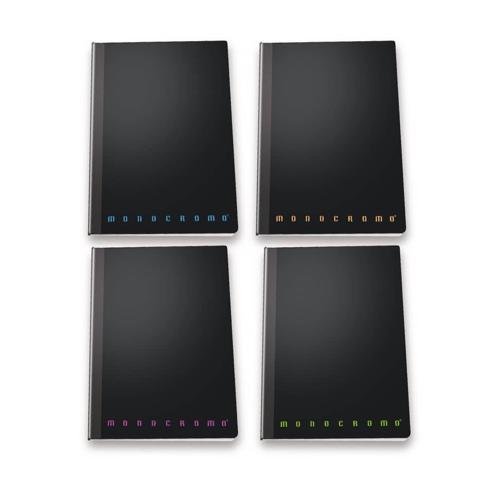 Maxi Filo Singer formato 22x28 cm - Fogli 60+2, carta interna da 80 gr, cover nera in PPL con scritta "Monocromo" in 4 colori fluo assortiti (arancione, blu, rosa, verde). Rilegatura filo singer. Prodotto certificato FSC. Rigatura 1R. Codice produttore: 02312181R