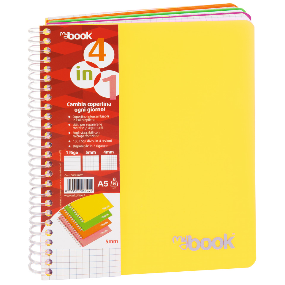 Quaderno Maxi spiralato con fori e copertina 4 in 1 Nikoffice A4 – 100 fogli 80g/m² a quadretti 5mm – copertina in colore assortito – 30NIK084