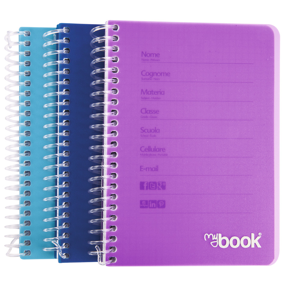 Quaderno formato A5 ad 1 rigo con spirale e con fori archivio da 80 fogli. Grammatura da 70gr, copertina e retroblocco in polipropilene 500 µm. Spirale in plastica trasparente riciclabile. Colori neon trasparenti assortiti.
