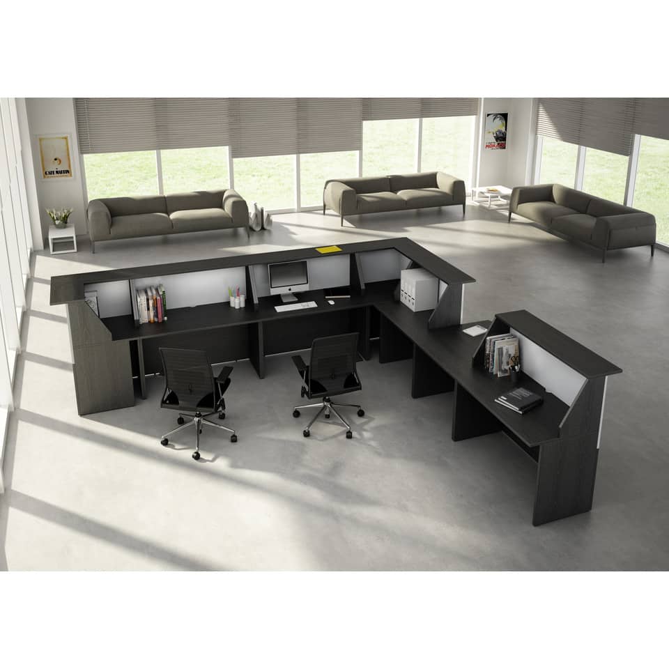 Scrivania angolare con rialzo per bancone reception Musa di Artexport reversibile destro/sinistro nella colorazione bicolore: nero venato - bianco.