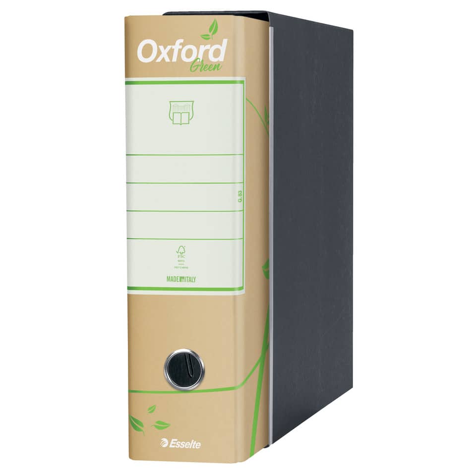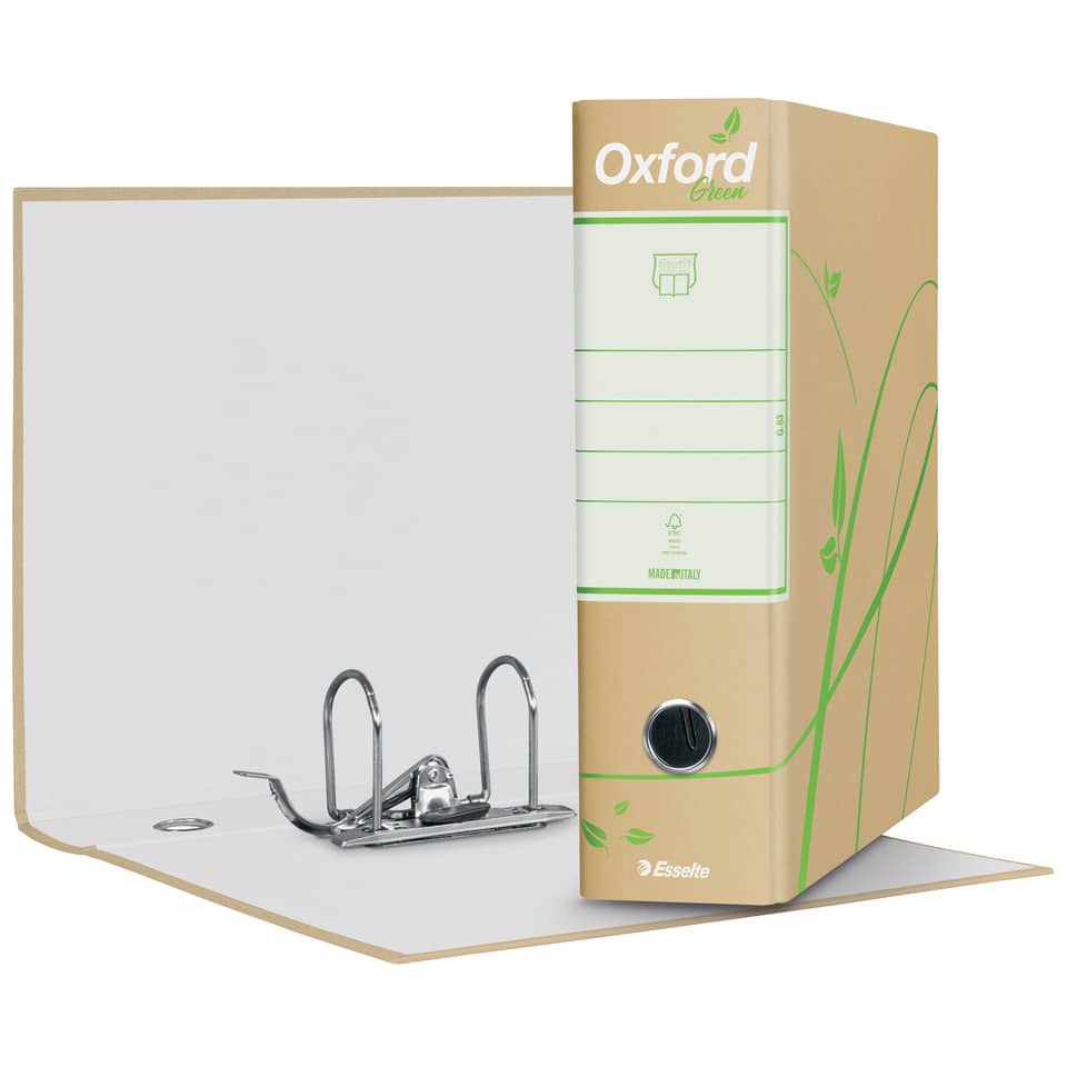 Il nuovo registratore Oxford Green rappresenta il simbolo dell'elevata qualità della produzione Esselte in una nuova veste sostenibile, certificata FSC. Oxford è il registratore più venduto sul mercato italiano e vanta innumerevoli tentativi di imitazione. Il nuovo motivo floreale, contraddistinto da un'accesa tonalità di verde, dona un tocco di freschezza e novità, rendendo questo classico senza tempo ancora più unico e particolare. La resistente struttura in cartone da 2 mm rivestita da una carta stampata 100% riciclata conferisce una finitura premium ad un prodotto adatto per qualsiasi tipo di archiviazione, anche le più esigenti.