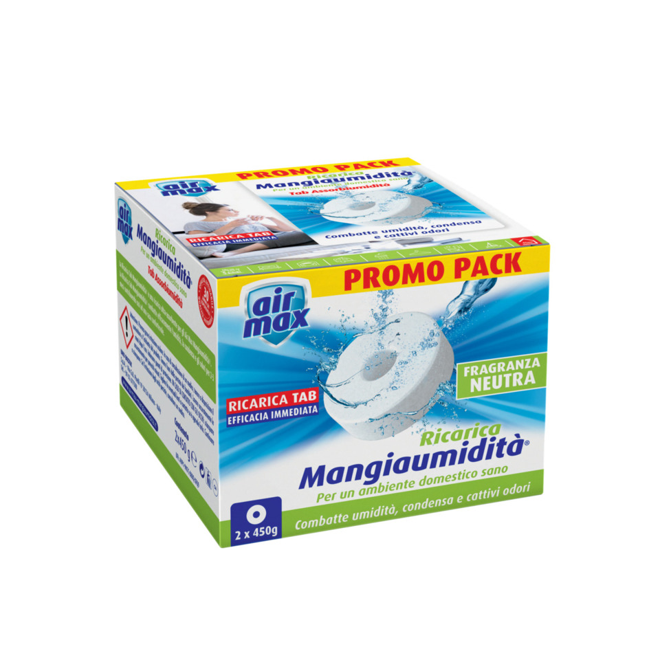 Ricarica Tab Air Max 2x450gr neutra. La Ricarica Tab è la tecnologia più avanzata nell'ambito dei cristalli assorbiumidità. È composta da cristalli compressi che si attivano più rapidamente rispetto alle altre ricariche: le prime gocce sono visibili già dopo 24 ore. Garantisce un utilizzo pulito e sicuro. Utilizzabile negli apparecchi deumidificatori Air Max 450g, disponibile in formato da 2 o da 4 Tab nelle fragranze neutra e lavanda. Effetto potente. Assorbimento ottimale dell'umidità. Pulito, sicuro e igienico. Disponibile neutro o con fragranza profumata. Durata: 450g lavorano per circa 3 mesi in una stanza fino a circa 50 m³ e assorbono circa 0.6L di acqua, in base alla temperatura, all'umidità presente nell'aria e alle dimensioni del locale. Modalità di utilizzo: Tagliare e aprire la confezione contenente la pastiglia. Sollevare il tappo dal dispositivo e inserire la pastiglia senza imballaggio nell'apposito vano. Ricollocare in posizione il tappo del dispositivo. Una volta che la pastiglia si è dissolta completamente, il dispositivo può essere svuotato facilmente. Macchie e residui: Le perdite accidentali di fluido possono causare macchie superficiali. In caso di perdite di fluido, lavare immediatamente con acqua abbondante, quindi tamponare ripetutamente finché la superficie non è asciutta. Evitare il contatto con cuoio, legno, pietra e metallo, poiché questi materiali possono subire alterazioni.