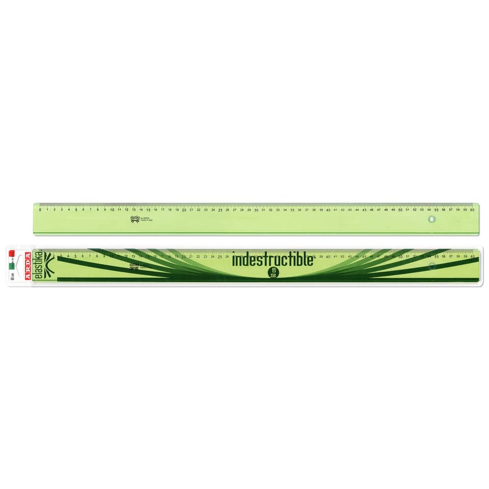 Riga in plastica serie Elastika da 60 cm. Brevettata, flessibile e con memoria di forma. Ergonomica con impugnatura antiscivolo, smusso e tirachina. Graduazione incisa a caldo dei numeri e dei millimetri con lettura facilitata. Angoli arrotondati nel rispetto delle normative di sicurezza a tutela del consumatore.