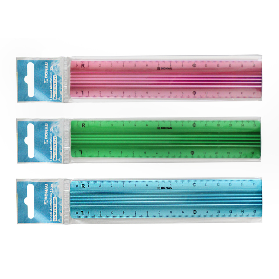 Righello realizzato in alluminio colorato. Lunghezza: 15 cm. Dotato di una scala per destrimani e mancini. Disponibile in 3 colori assortiti: verde, azzurro e rosa. Confezione composta da 12 pezzi.