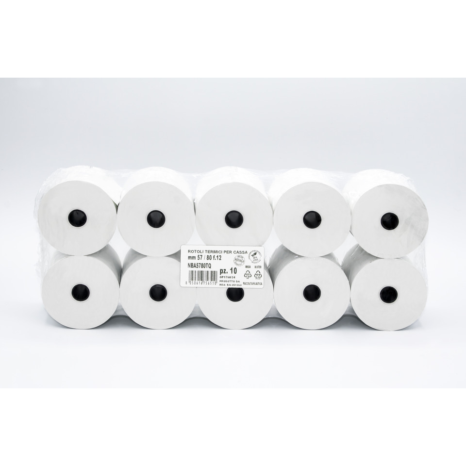 Rotoli registratore di cassa Rotolificio Pugliese Exclusive BPA FREE – 57 mm x 80 m – foro 12 mm – 55g/m² – NBA5780TQ (conf.10)