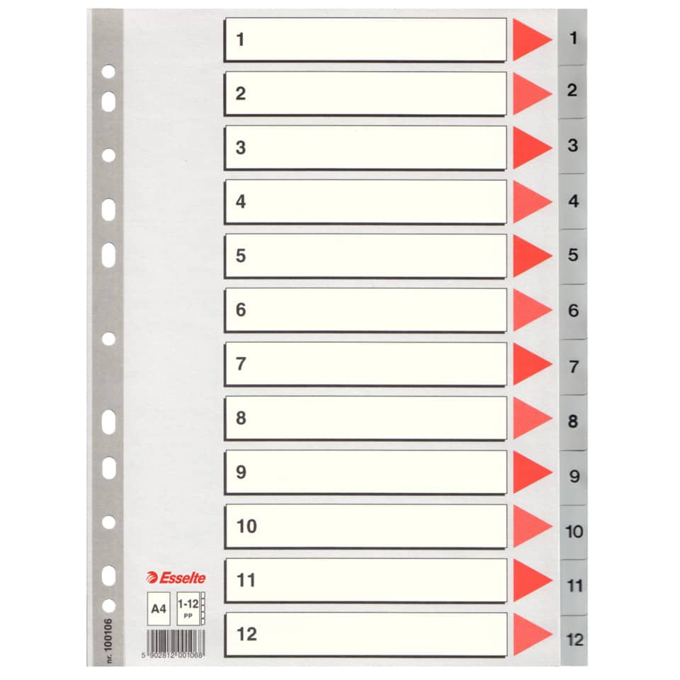Rubriche numeriche in polipropilene di elevata qualità, dotate di indice frontale in robusto cartoncino nel nuovo design a frecce rosse e rinforzi in mylar sul lato forato. I tasti a scalino sono in polipropilene grigio, con i numeri stampati in nero. Formato A4. Codice produttore: 100106