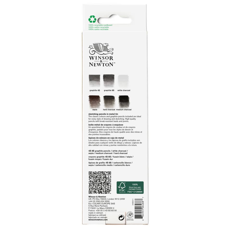 Scatola in metallo composta da 6 matite da schizzo Winsor&Newton così composto: 2 matite di grafite 4B e 8B, 1 matita bianca sfumabile, 1 matita seppia sfumabile, 1 matita carboncino media e 1 matita carboncino dura. Codice produttore: 0490011