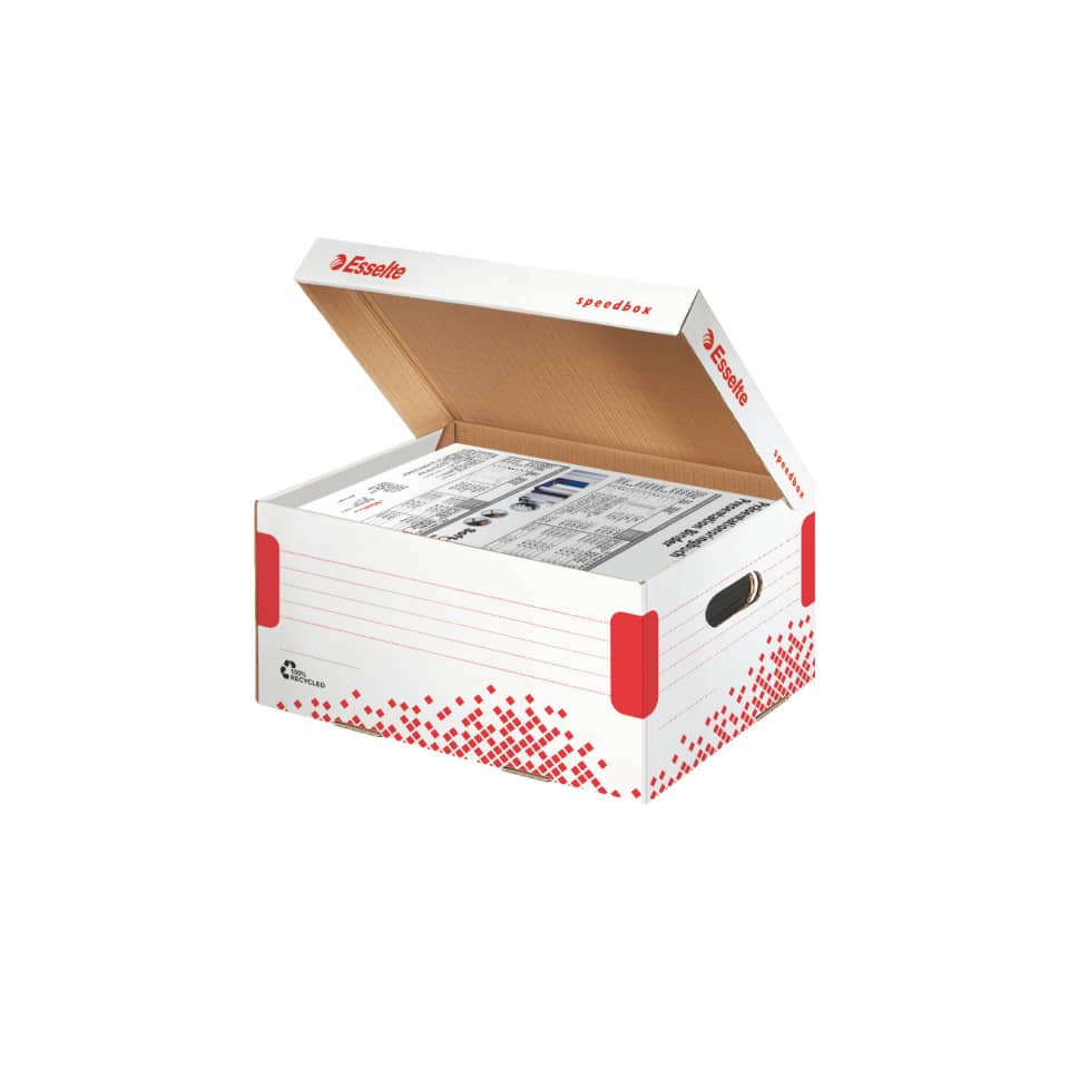 Scatola archivio Esselte SPEEDBOX con coperchio integrato bianco/rosso 25,2×19,3×35,5 cm – 623911