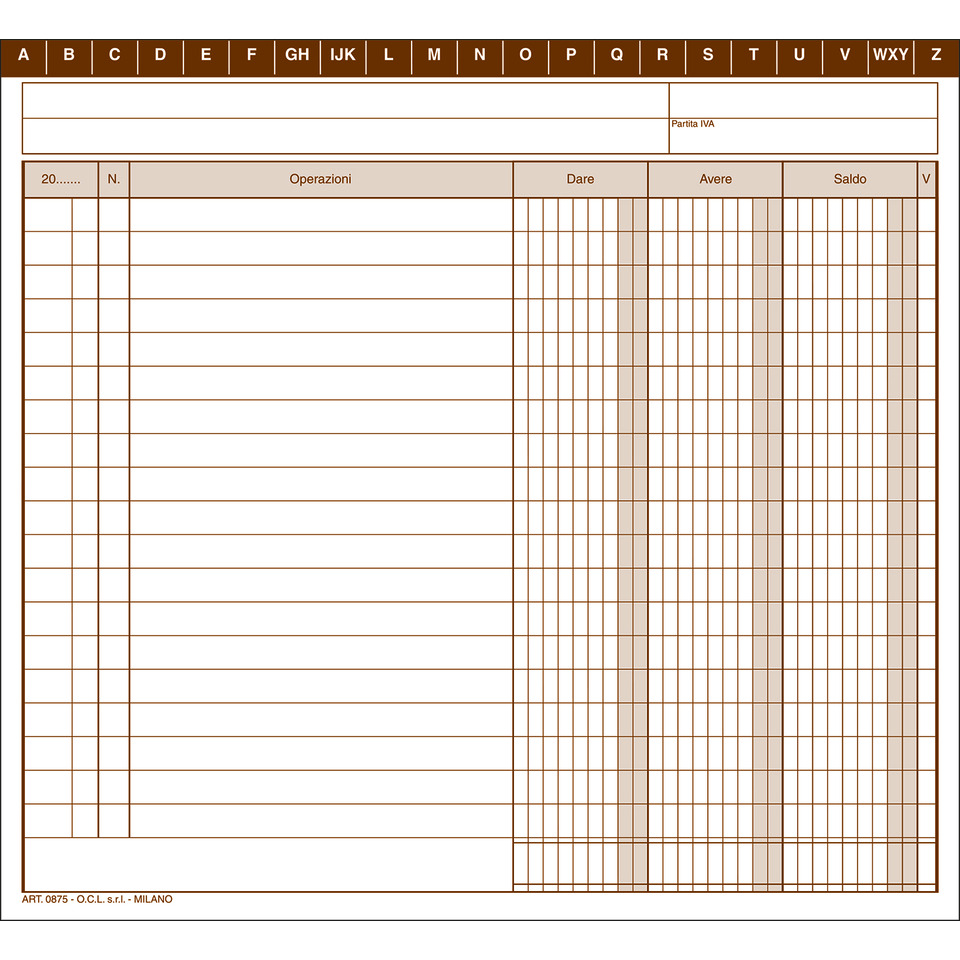 Schede a tre colonne Dare - Avere - Saldo. Formato: 187x173 mm.