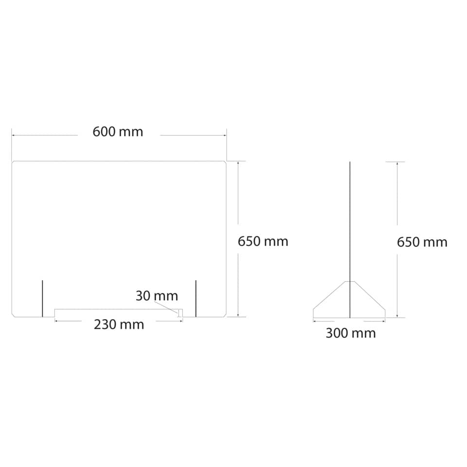 Schermo protettivo da banco trasparente con portello passante di 250 x 150 mm. Protegge da potenziali contaminazioni. Dimensioni 600 x 650 mm.