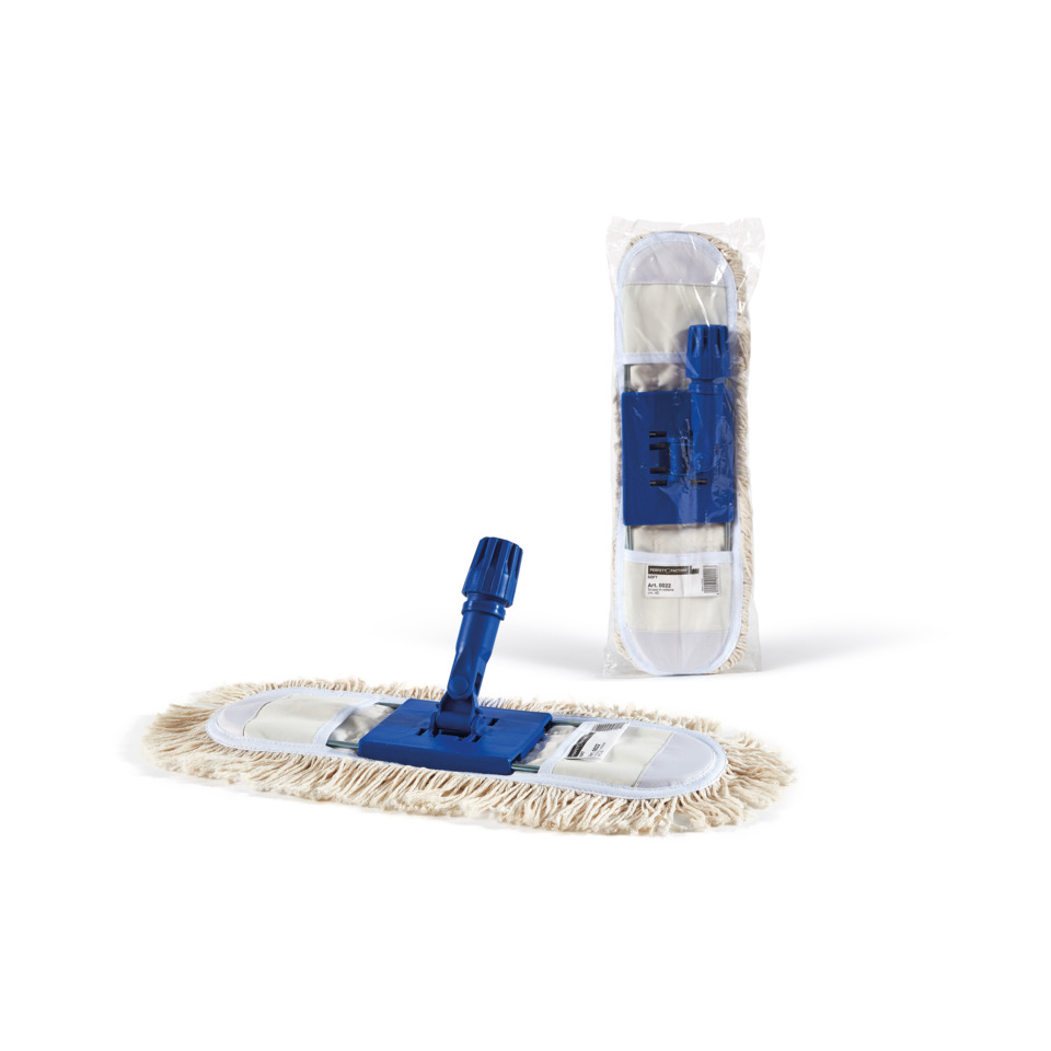 Scopa con frange in puro cotone per grandi superfici (ospedali, supermercati, scuole), progettata per catturare e trattenere la polvere. Dotata di ghiera universale per manici senza filettatura (diametro max Ø 23 mm, legno o alluminio) e di bocchettone snodato a 360° per raggiungere i punti più difficili. Frangia sfilabile e lavabile in lavatrice fino a 60°C; consigliata l'asciugatura all'aria per mantenere la qualità del filato. Misure telaio 40×12 cm; ingombro frangia 52×21 cm; altezza bocchettone 15 cm.