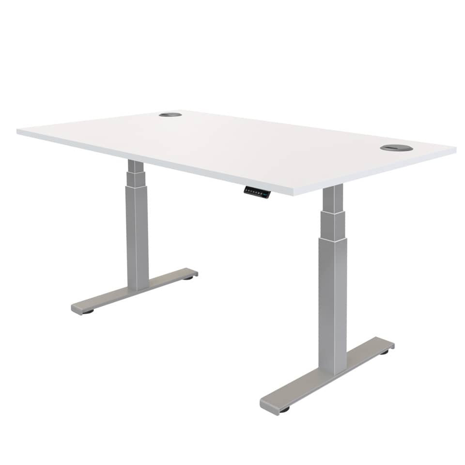 Scrivania a regolazione elettrica in altezza da 64 cm a 126 cm. Completa di piano bianco, dimensioni 1600 x 800 mm e spessore 25 mm. Dotata di fori passanti da 8 cm. Struttura LEVADO disponbile nei colori bianco o grigio.
