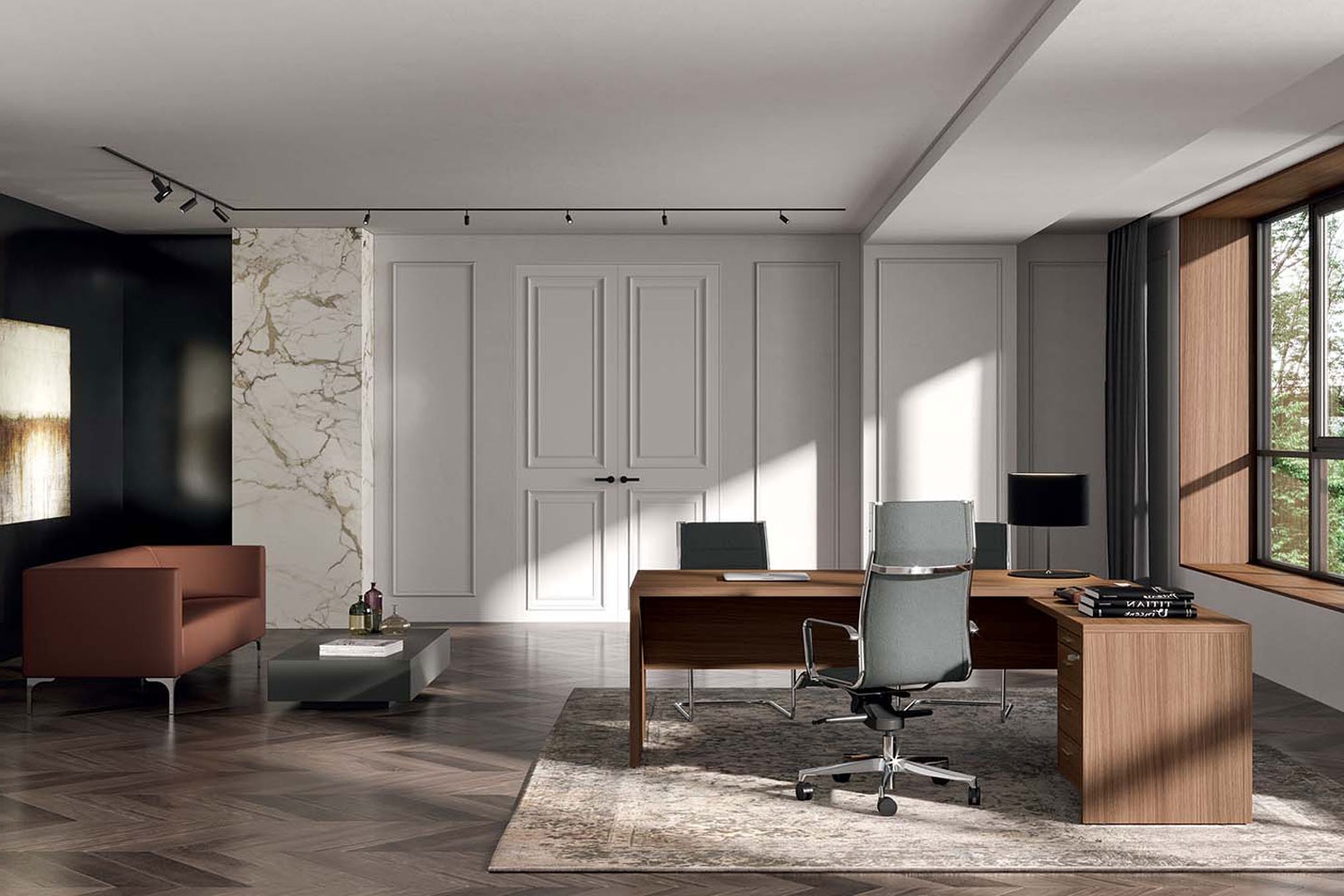 Scrivania direzionale angolare destra Quadrifoglio T45 Noce canaletto 192x190h.76,8 cm fianco a pannello in melaminico 38 mm