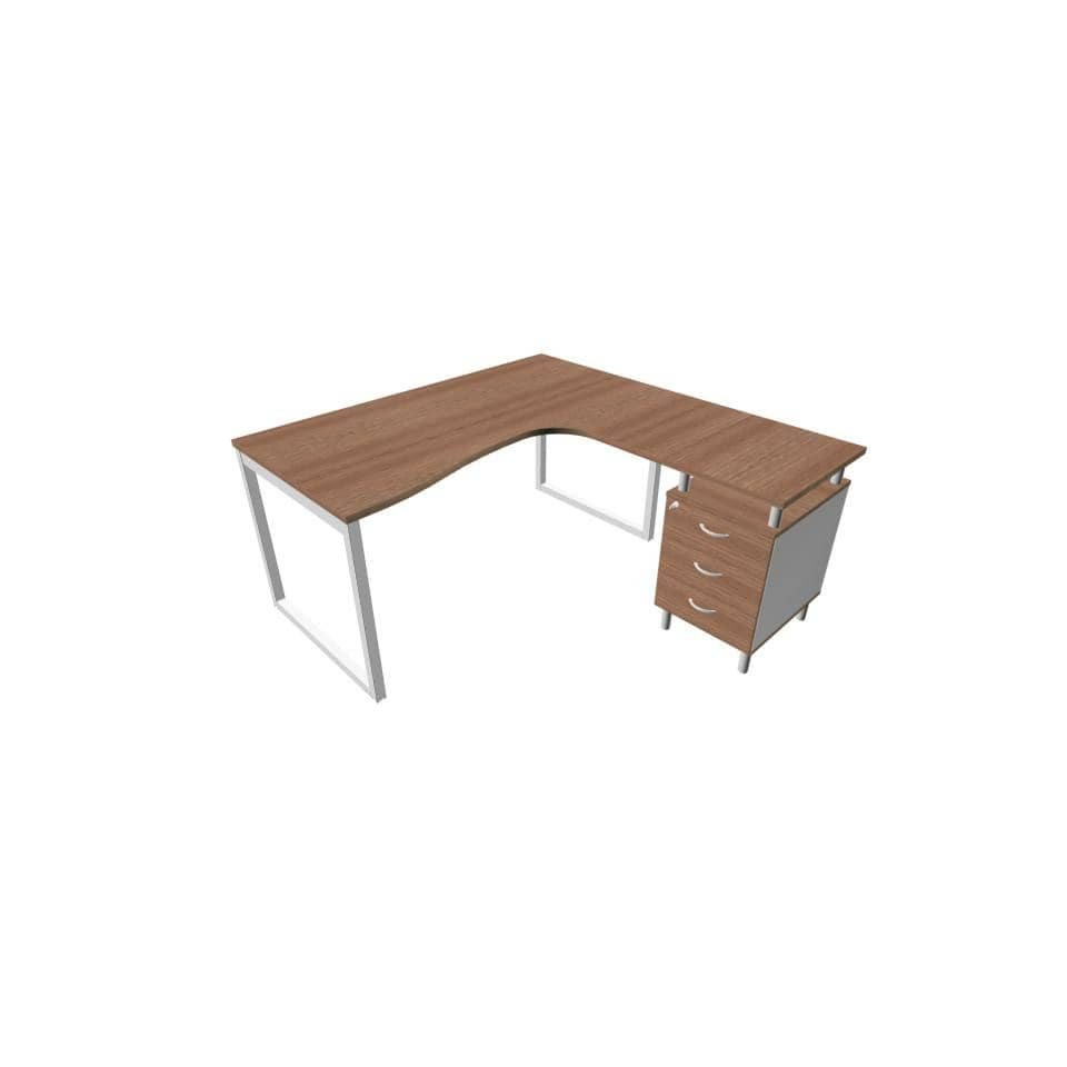 Scrivania con cassettiera a destra piano Noce canaletto 160x165xh.75 cm gamba ad anello acciaio Argento Practika P2