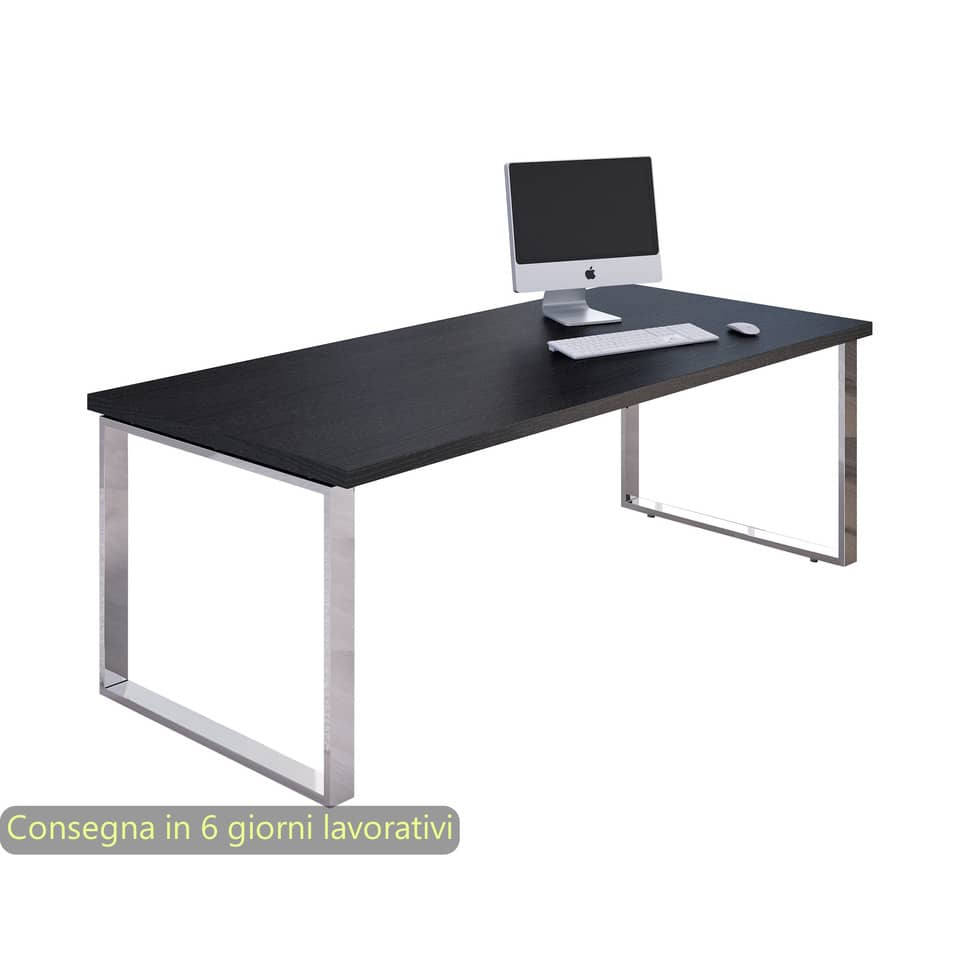 Scrivania direzionale nera con fianchi in metallo verniciato effetto cromato.