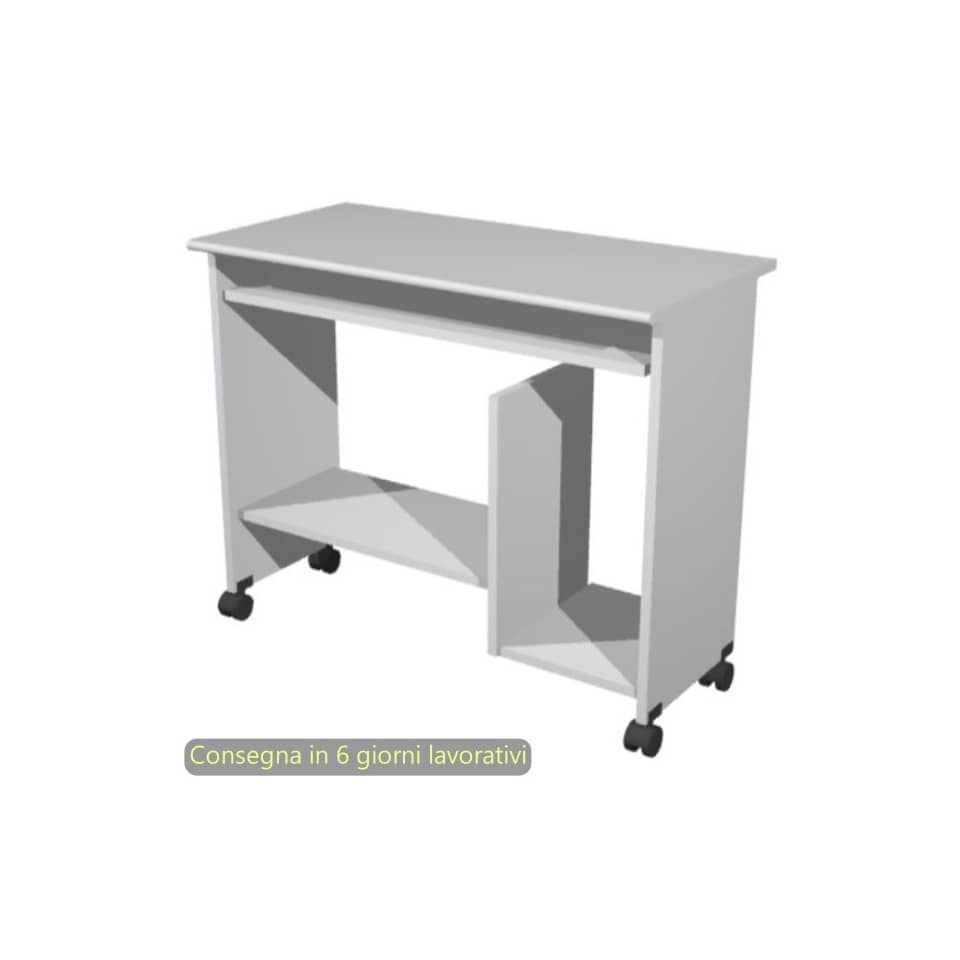 Scrivania su ruote compatta ad ingombro contenuto con 2 ampi vani a giorno ed un ripiano estraibile per la tastiera, ideale per lo Smart Working e l'Home Office. Dimensioni L. 92 x P. 45 x H. 76 cm. Piano sp. 18 mm con bordo antiurto in ABS 1 mm e privo di spigoli vivi. Materiale melaminico bilaminato antigraffio ed antiriflesso conforme alle norme UNI e EN classe E1. Completo di ripiano portatastiera estraibile (L. 86,1 x P. 29 cm spessore 18 mm). Vano a giorno porta CPU (L. 27,4 x P. 33 x H. 52 cm). Piano porta stampante L. 59 x P. 29 cm x H. 40,5 cm dal piano superiore. Dotata di ruote pivottanti. Imballi in alto spessore in cartone riciclato a tutela dell'ambiente. Produzione certificata conforme alle procedure UNI EN ISO 9001. Certificazioni FSC e PEFC. Colore grigio.