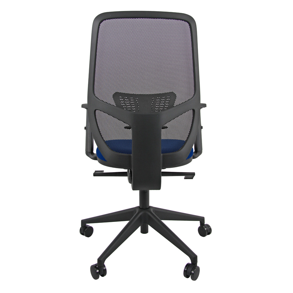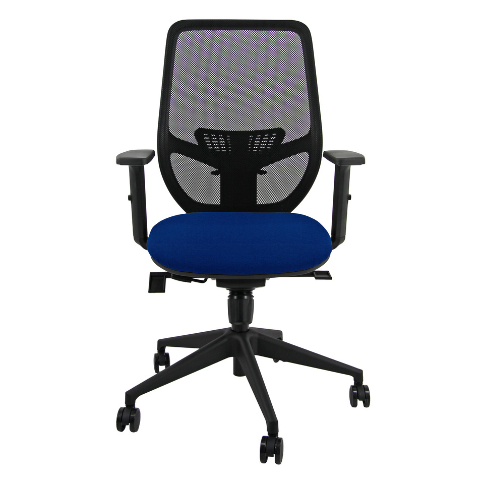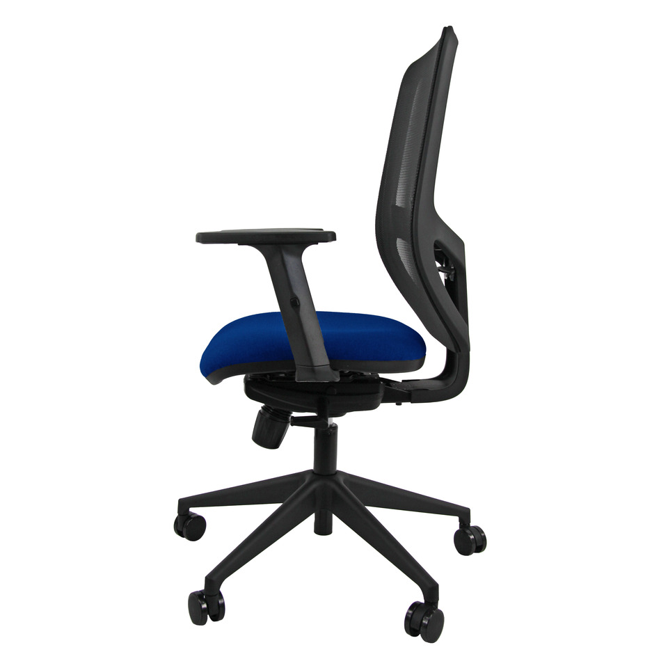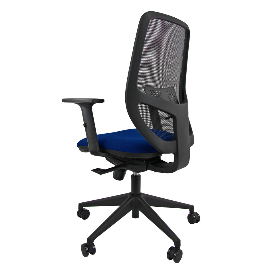 Sedia operativa girevole Aria con schienale in rete blu con supporto lombare regolabile. Rivestimento sedile in tessuto ignifugo blu. Fornita con braccioli ACCBRFRR2 (D110074). Taglia L. Utilizzo consigliato Standard: 12h. Portata massima 130 kg. Struttura acciaio. Base nylon. Ruote Ø 65 mm nylon. Sedile: materiale esterno: PPL; materiale interno: PPL rinforzato con barre acciaio; spugna: spugna T 25 h 6 cm. Schienale: materiale esterno: nylon; materiale interno: supporto in nylon + rete; Interno/Spugna: schienale in rete. Meccanismi: Elevazione a gasb - Supporto lombare regolabile contatto permanente - Meccanismo synchro con traslatore sedile. schienale a contatto permanente controllo forza spinta schienale movimento di ritorno dello schienale con antishock. Certificazioni: Gas certificato TUV; A norma DL 81/08; Conforme a certificazione EN 1335 A 2020. Altezza totale: 105-118 cm. Profondità totale: 70 cm. Altezza sedile (seduta da terra): 43-55 cm. Larghezza sedile: 47 cm. Larghezza del sedile con i braccioli: 62 cm. Profondità sedile: 46 cm. Altezza schienale: 61 cm. Larghezza schienale: 48 cm. Altezza braccioli da terra: 63 cm. Base Ø 70 cm.