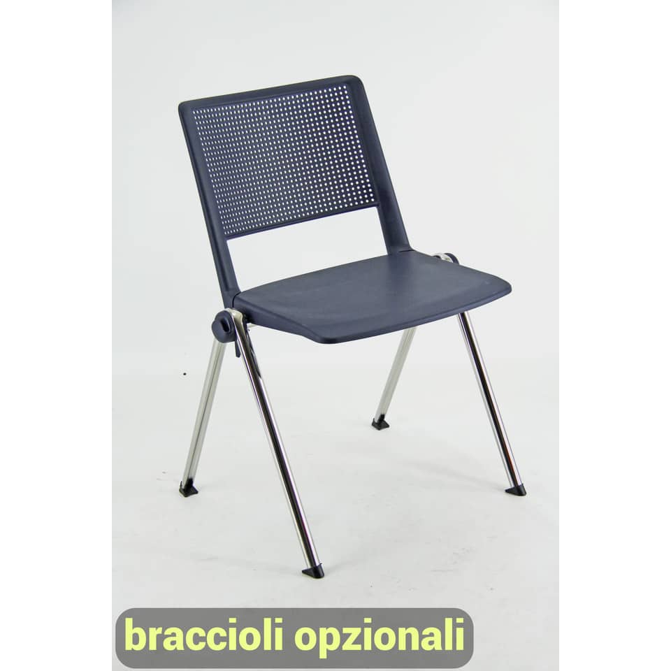 Seduta visitatore 4 gambe struttura cromata, alta impilabilità; Alt.tot.: 80; Prof.tot.: 54; Alt.schienale: 37; Larg.schienale: 44; Larg.seduta: 45; Prof.Sedile: 41; Braccioli opzionali. Colore blu.