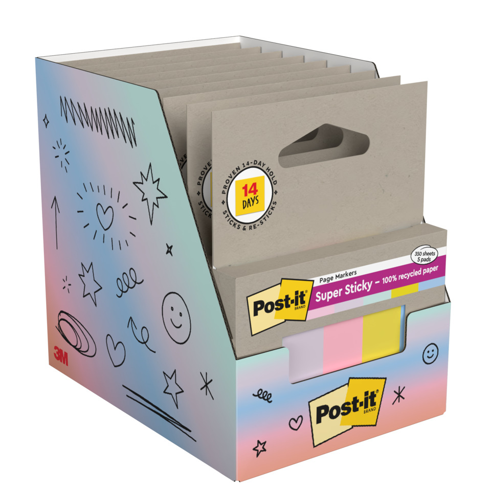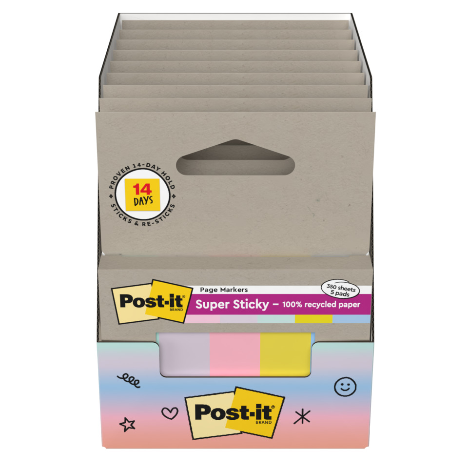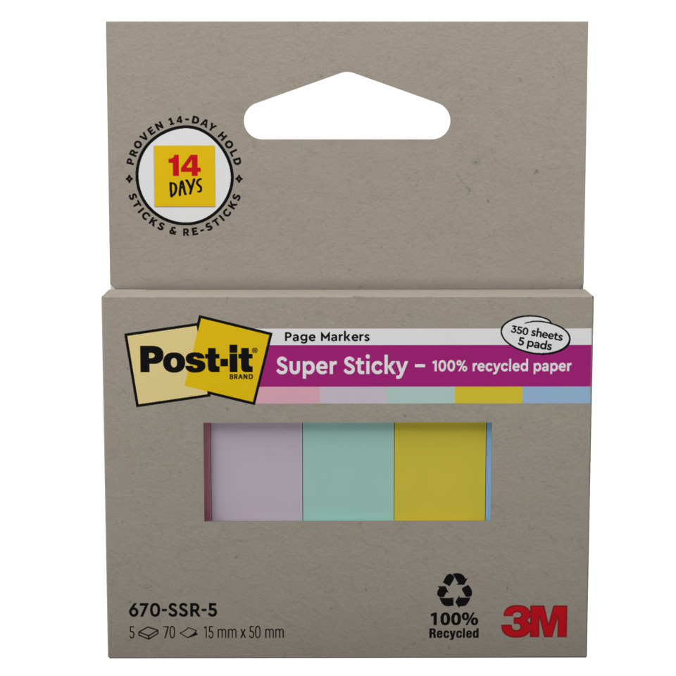 Segnapagina Post-it® Super Sticky in carta riciclata 15×50 mm – colori assortiti – 70 segnapagina (conf.5)