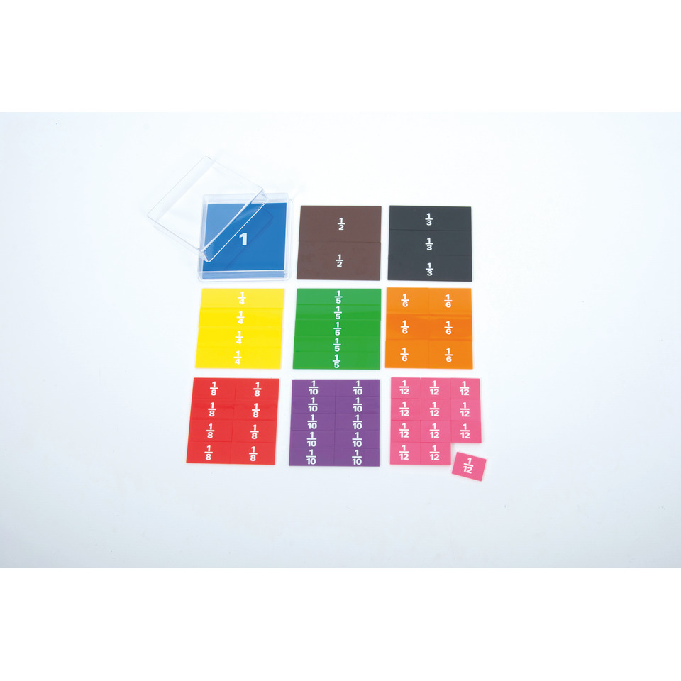 Set di pezzi di dimensioni proporzionali che rappresentano: un'intero, terzi, quarti, quinti, sesti, ottavi, decimi e dodicesimi in 9 colori distinti con stampa su ogni pezzo. Supporta l'apprendimento in matematica nelle aree: frazione e percentuale, comunicazione e lingua, ragionamento.